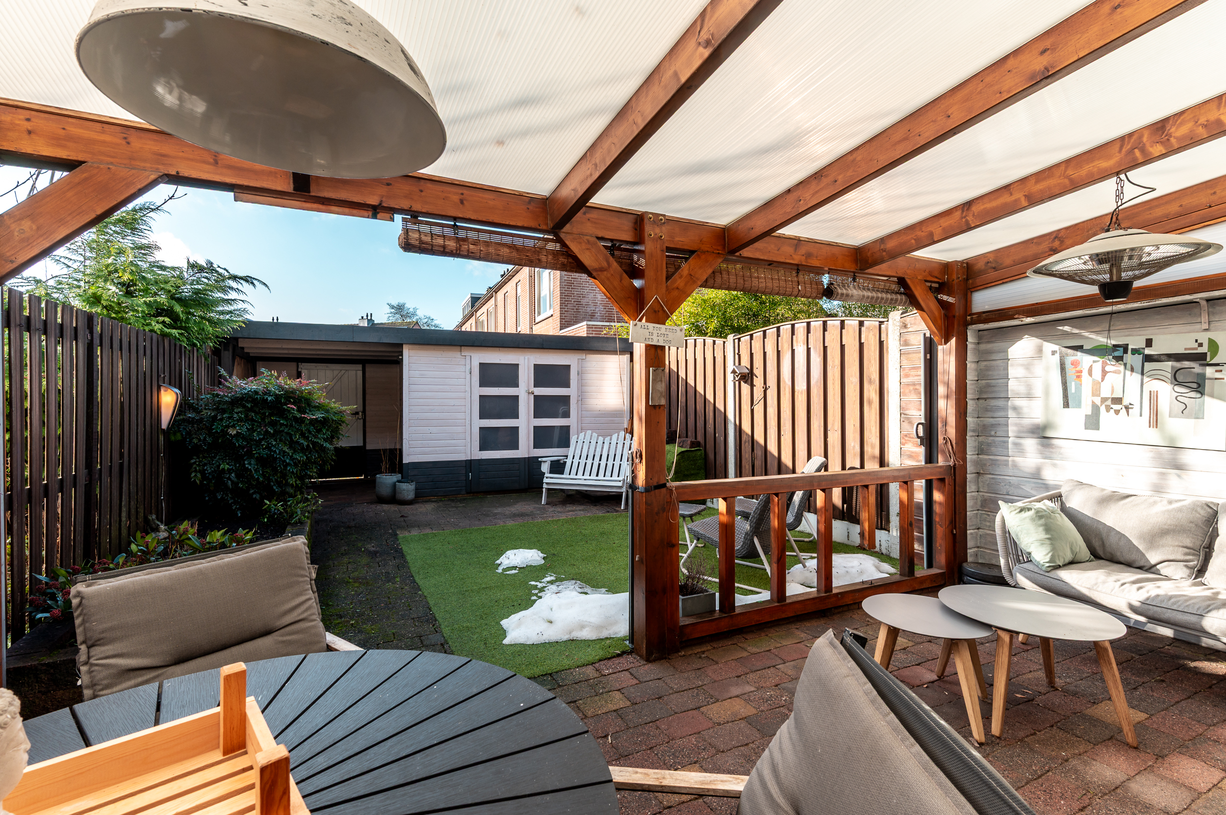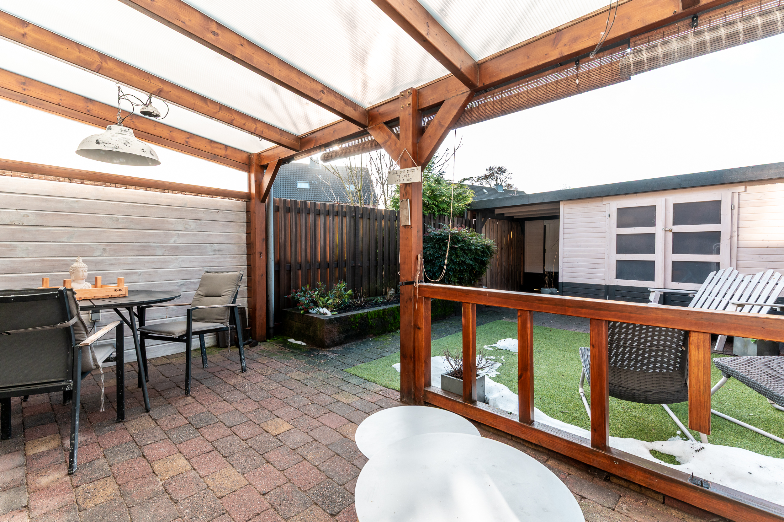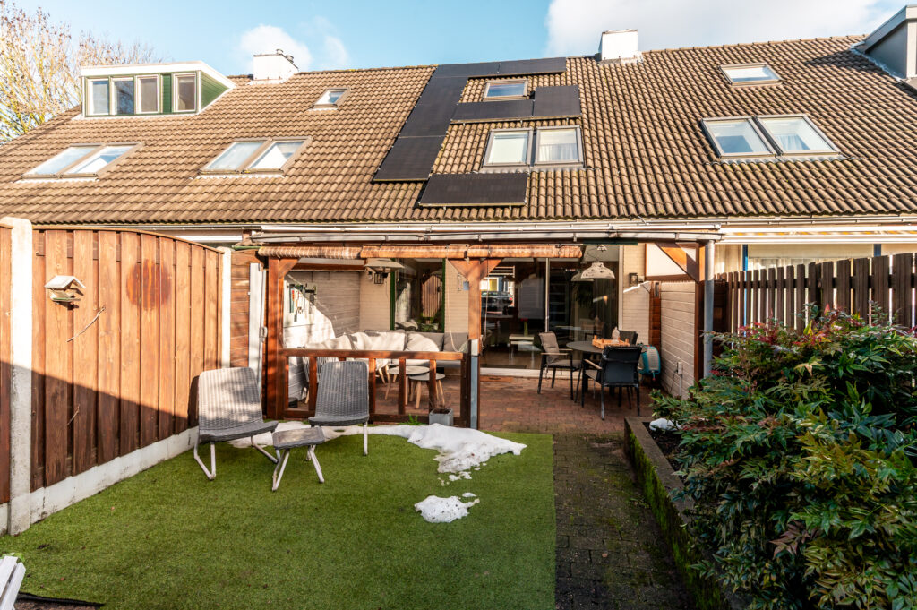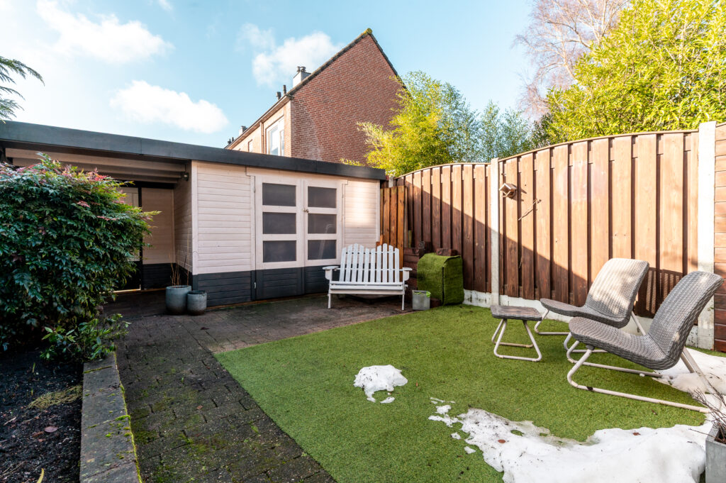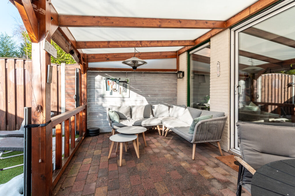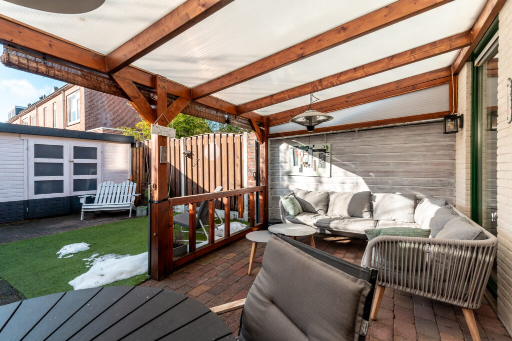 Tevens is de tuin voorzien van een fijne overkapping indien u de schaduw wil opzoeken. Achterop het perceel staat nog een vrijstaande houten berging (ca. 7 m²) met overkapping en poort naar achterom.