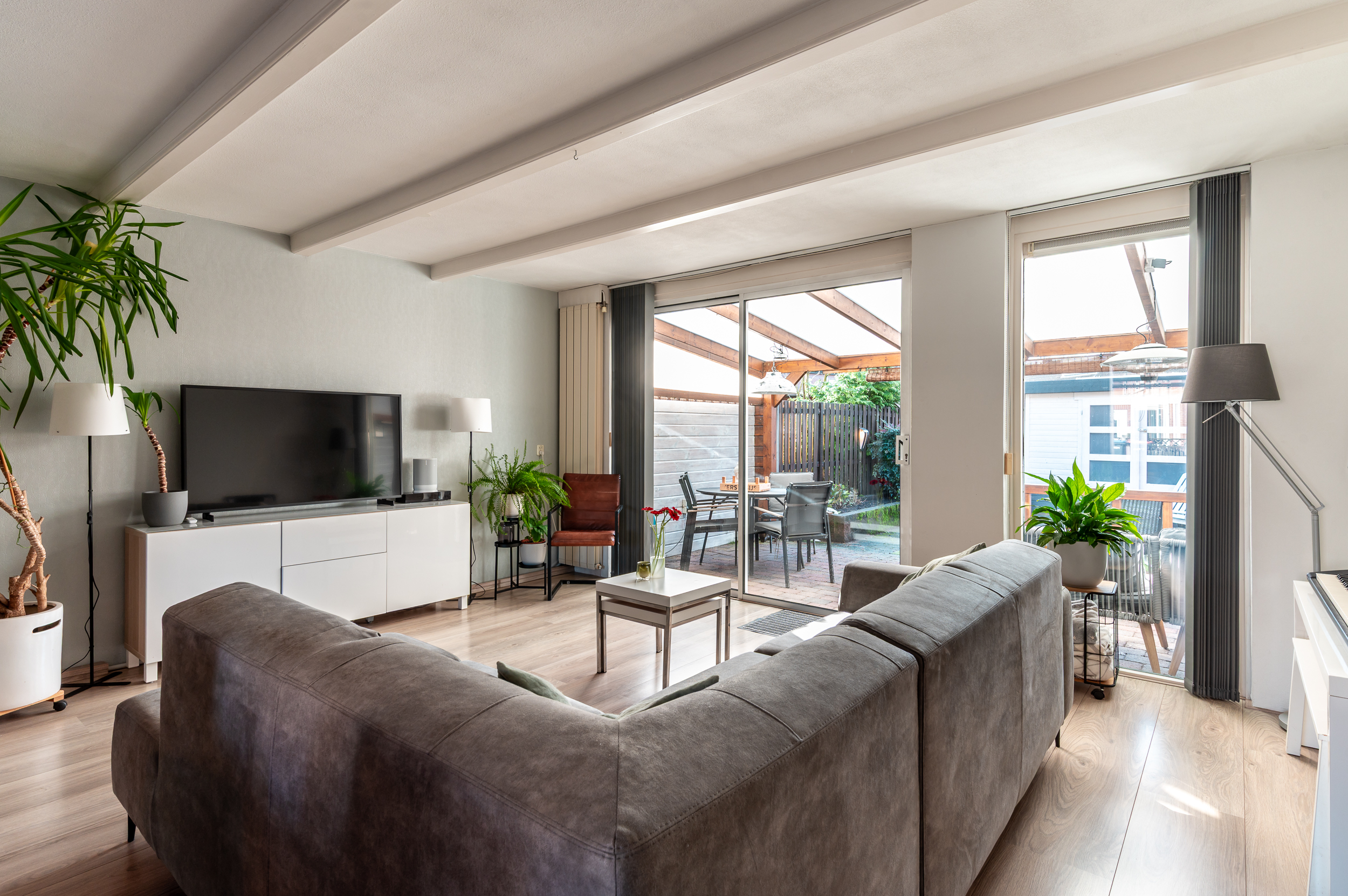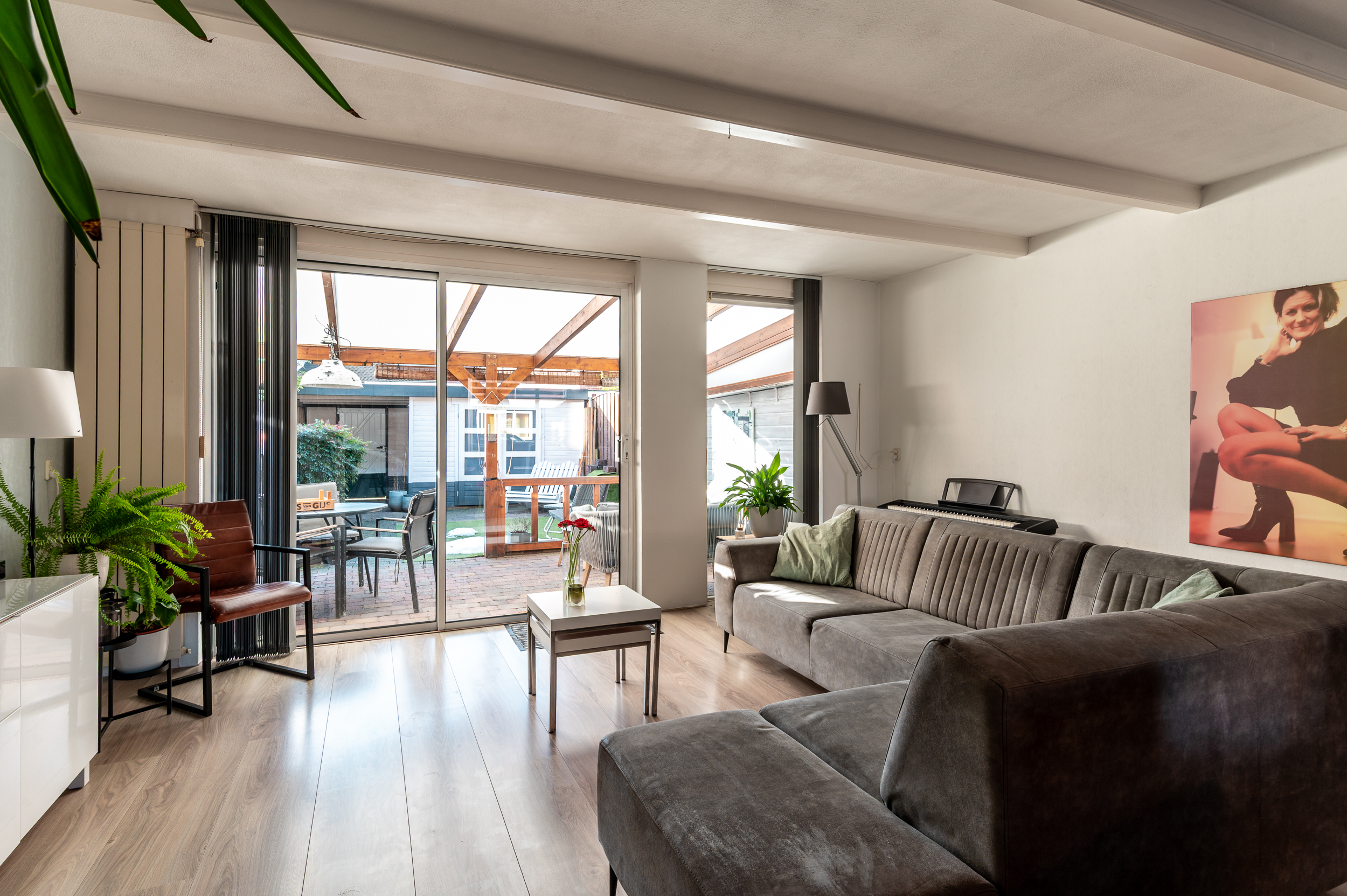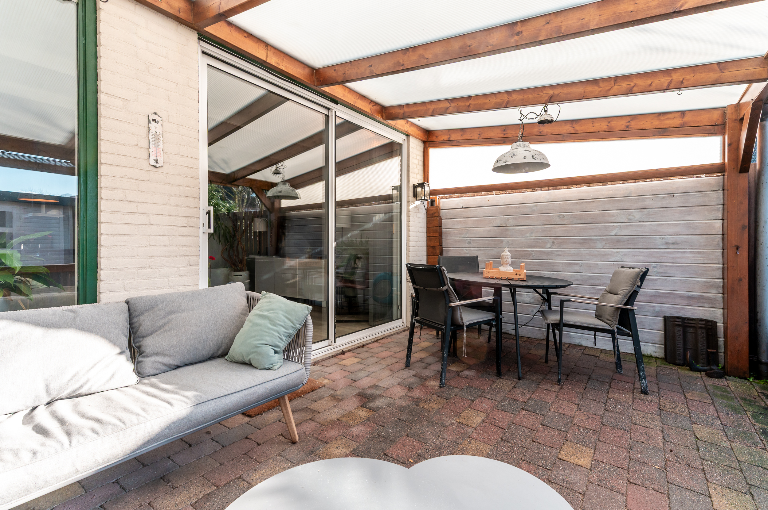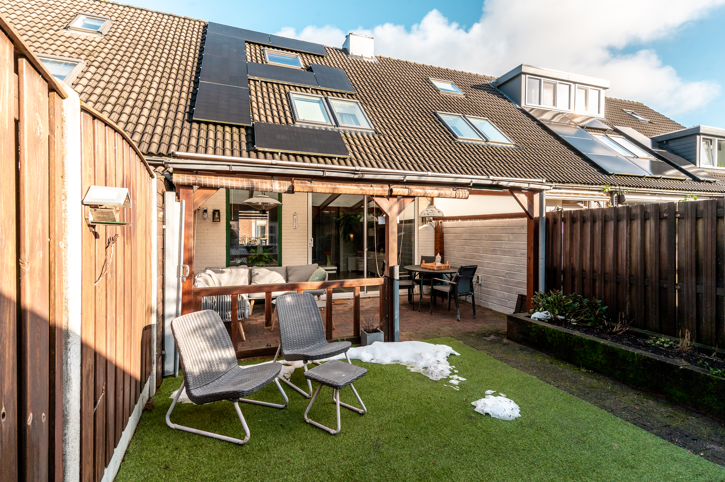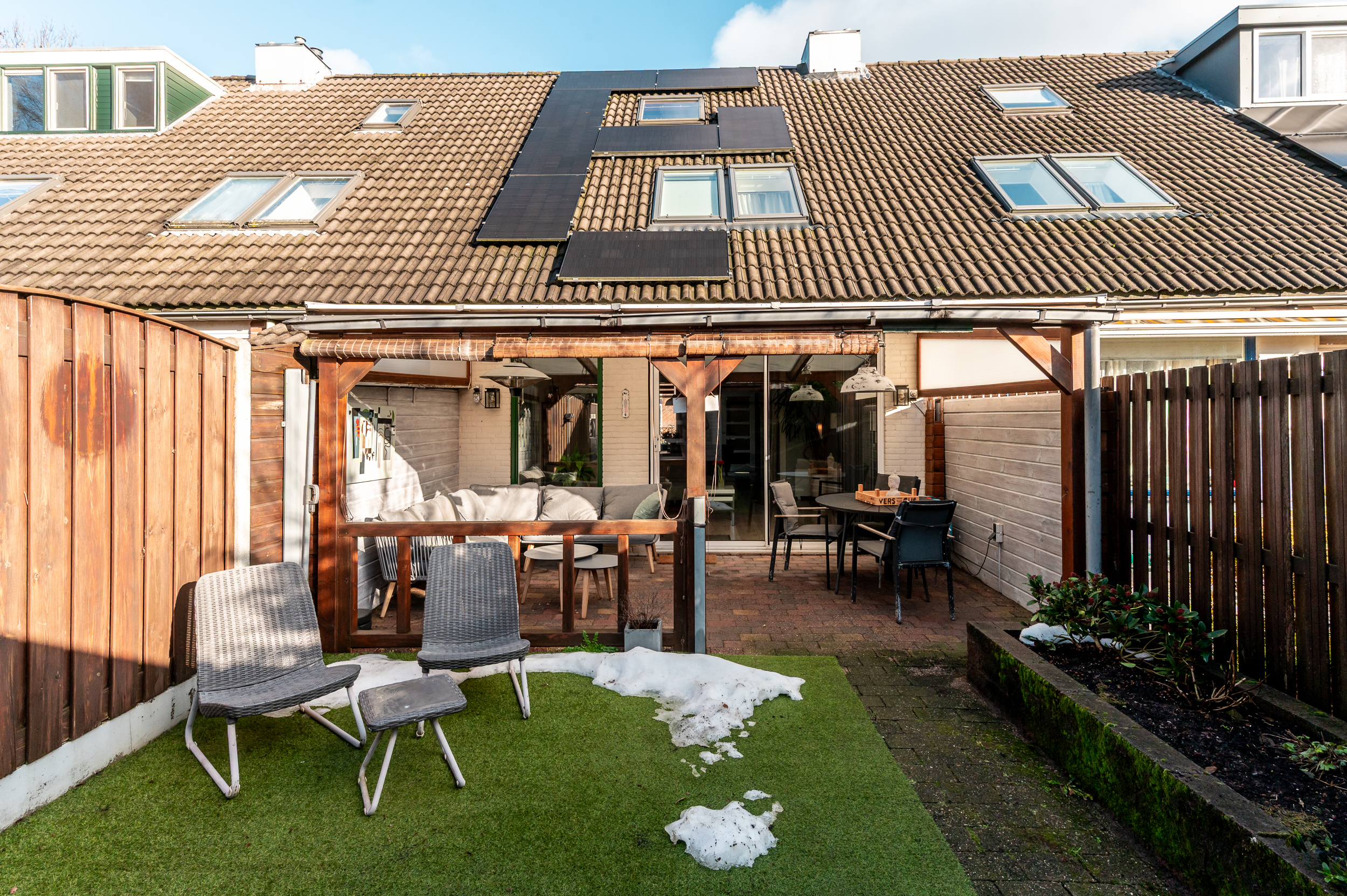 Tevens is de tuin voorzien van een fijne overkapping indien u de schaduw wil opzoeken. Achterop het perceel staat nog een vrijstaande houten berging (ca. 7 m²) met overkapping en poort naar achterom.