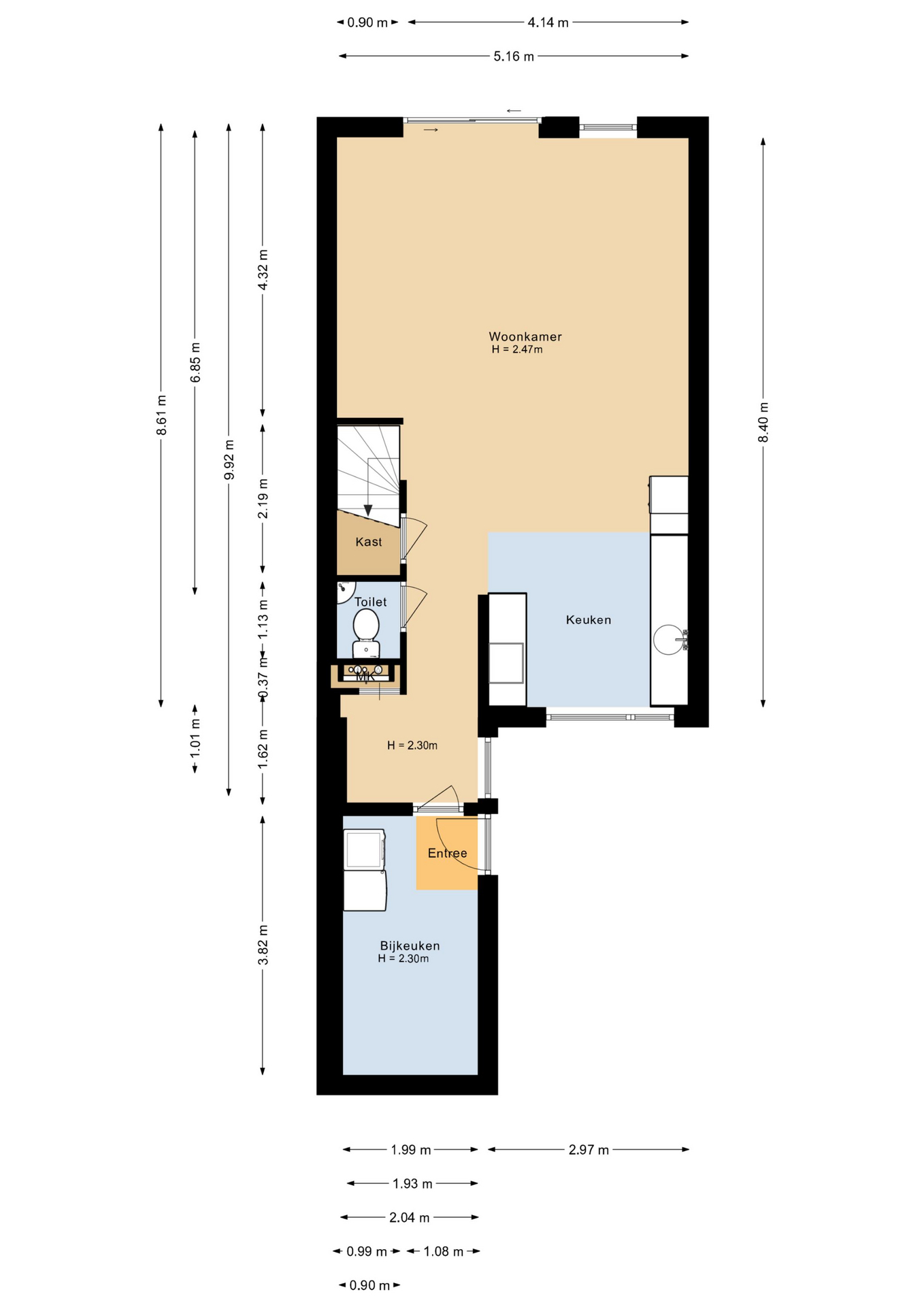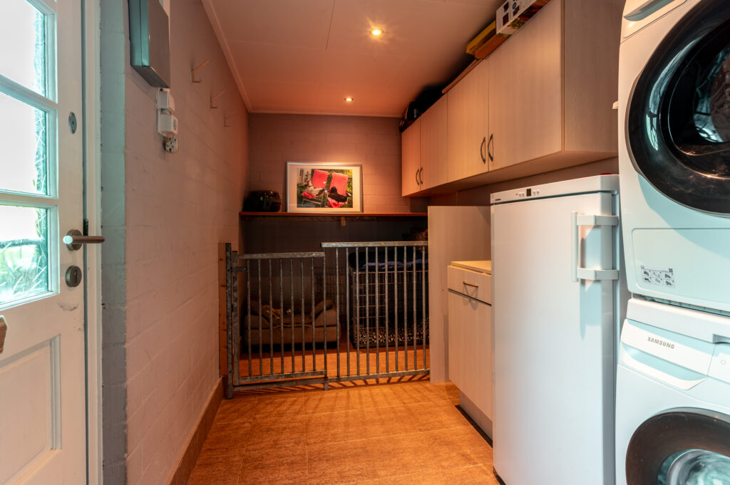 Entree, hal, bijkeuken met opstelling wassen/drogen, toilet met fonteintje, open keuken voorzien van diverse inbouwapparatuur, ruime en lichte woonkamer (ca. 22 m²) met trapkast en schuifpui naar de tuin.