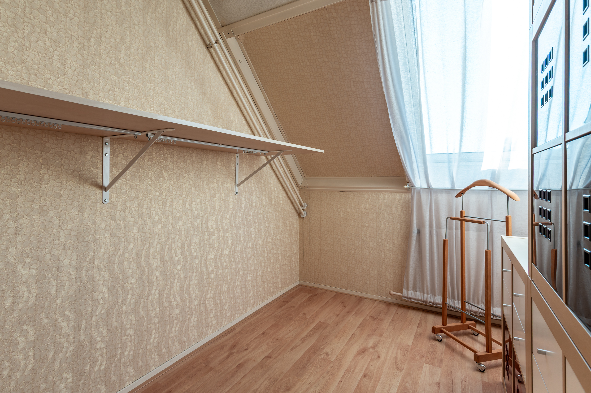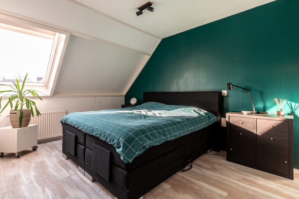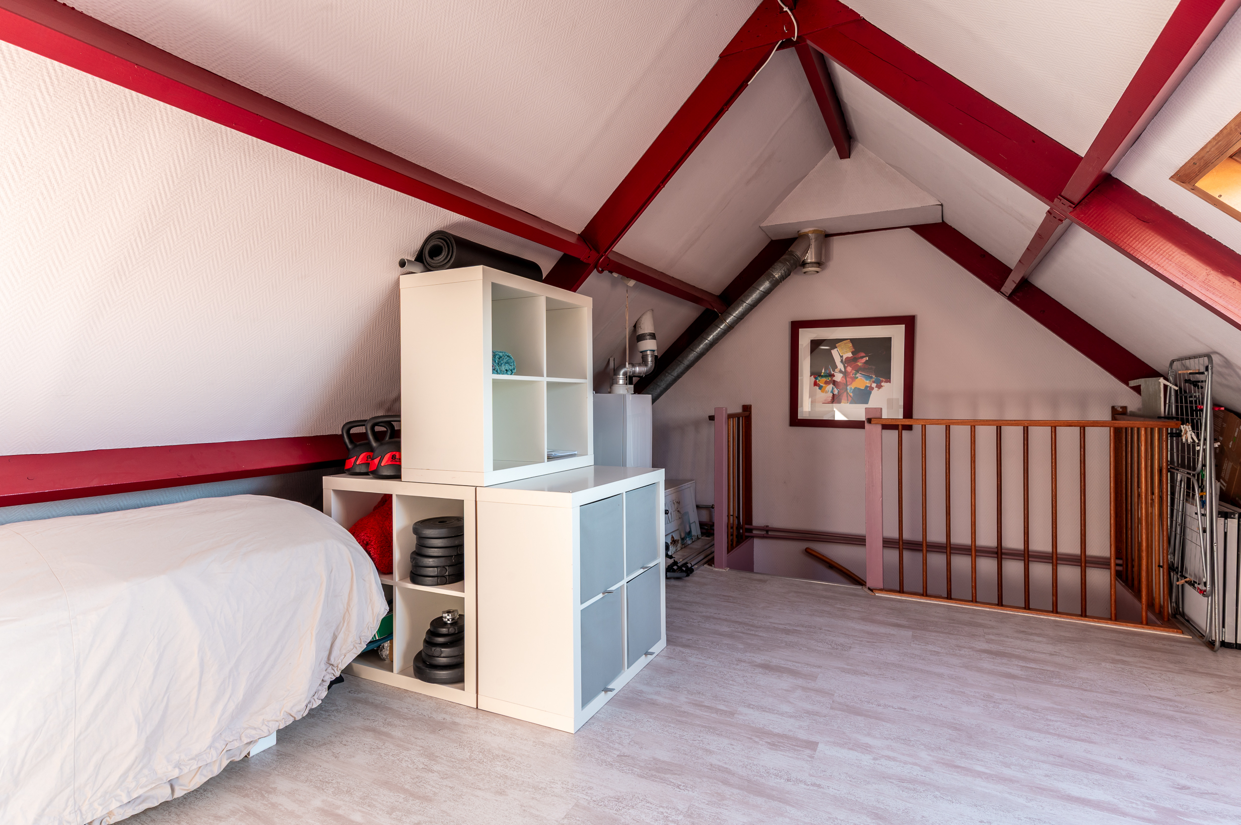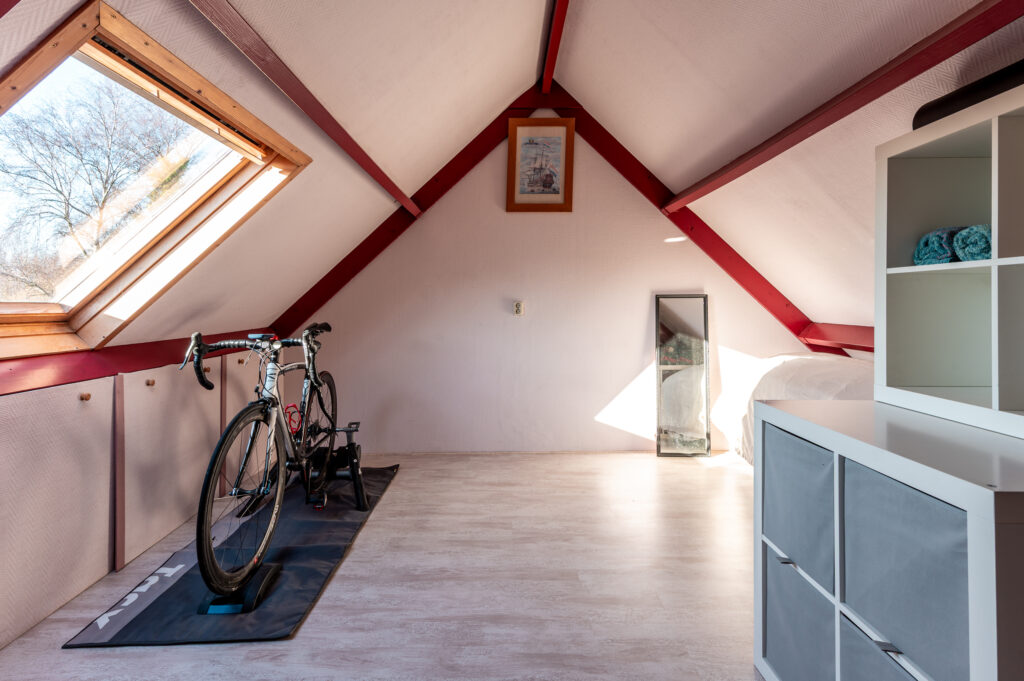 Slaapkamer 4 (ca. 25 m²) met opstelling CV-ketel, opbergruimte achter de knieschotten en dakraam.