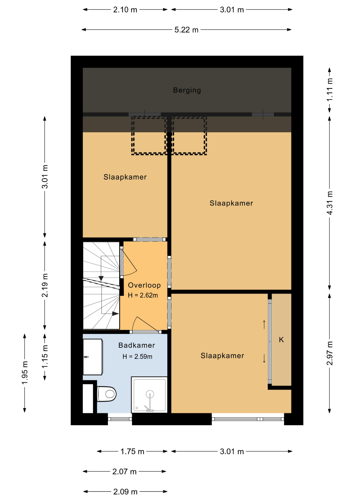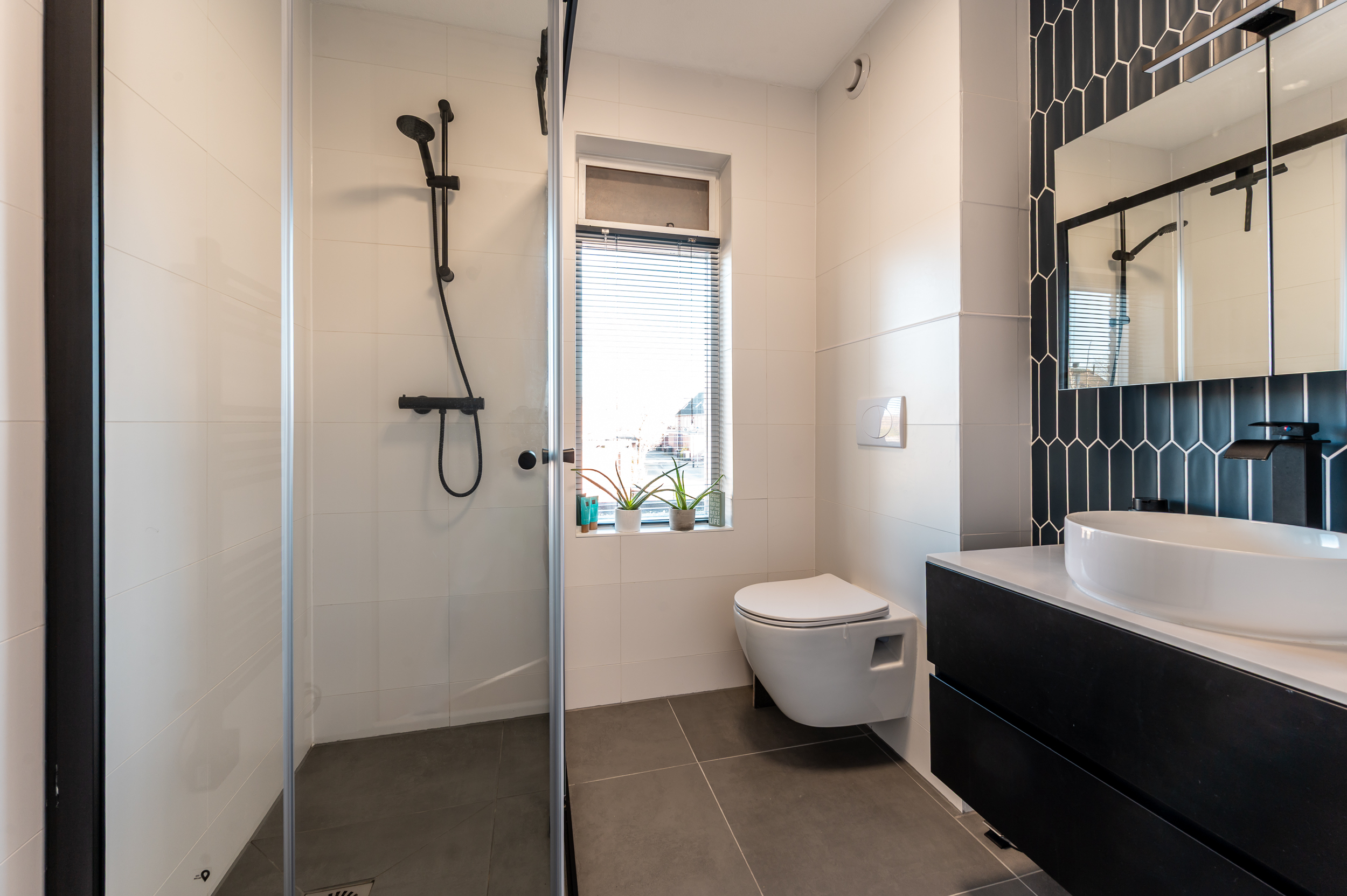 Overloop, slaapkamer 1 (ca. 13 m²) met opbergruimte achter de knieschotten en dakraam, slaapkamer 2 (ca. 9 m²) met vaste kast, slaapkamer 3 (ca. 6 m²) met opbergruimte achter de knieschotten en dakraam, moderne badkamer voorzien van wastafel met meubel, toilet, elektrische designradiator en douche.