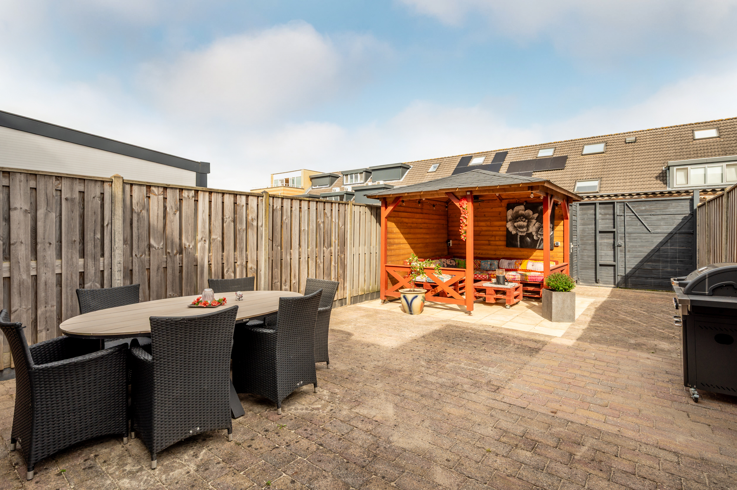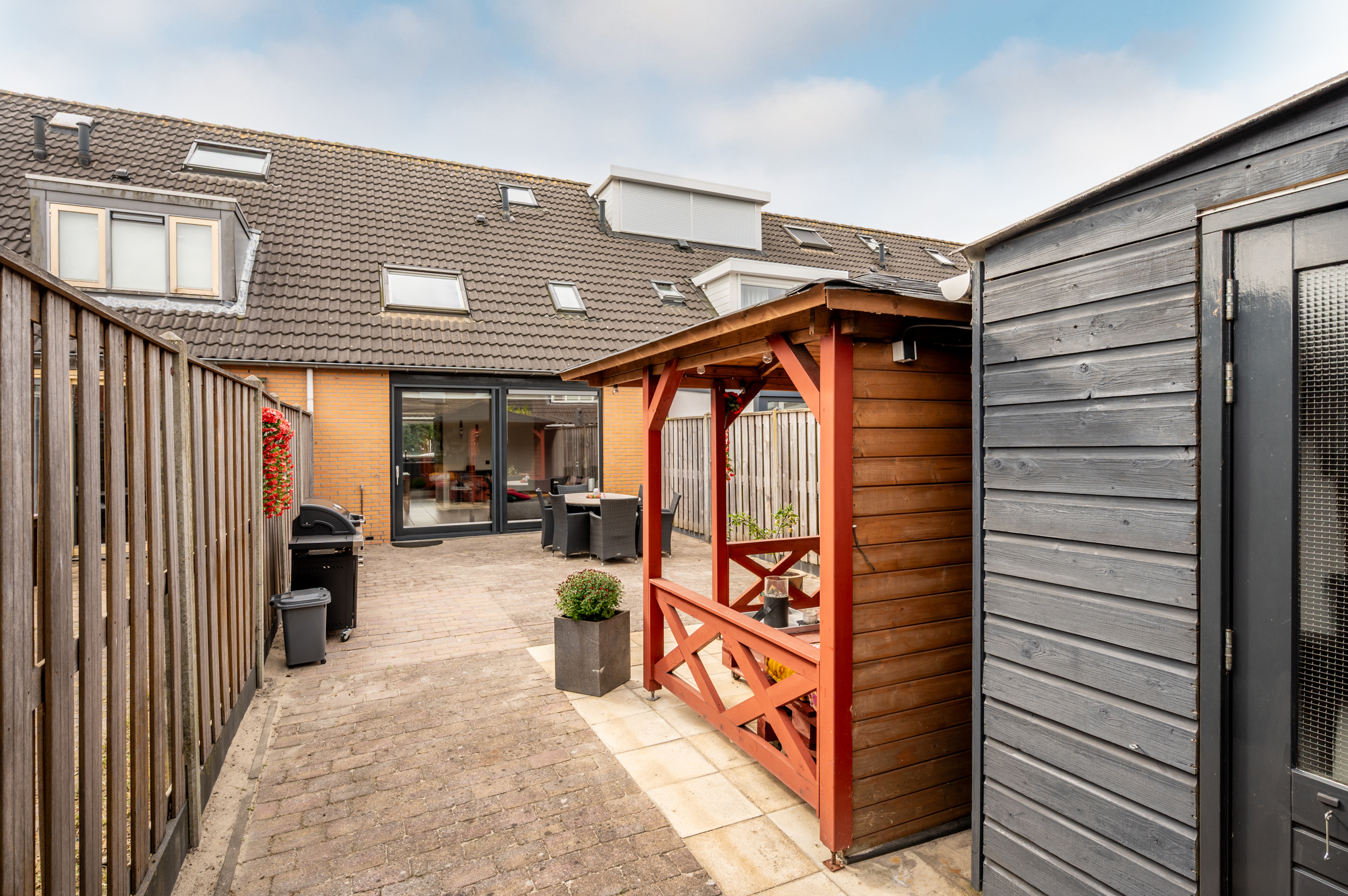 De verzorgd aangelegde tuin is gelegen op het noordwesten en voorzien van bestrating, gevelkraan, een overkapping en een vrijstaande berging (ca. 7 m2). De tuin is onderhoudsarm aangelegd, wordt omheind middels schuttingen, geeft veel privacy en is tevens toegankelijk middels een praktische achterom.
