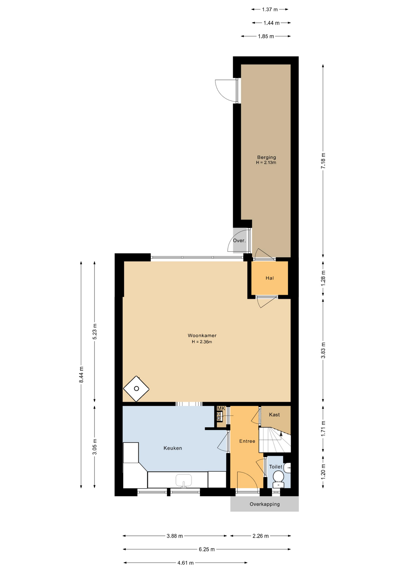 Entree, hal, toilet met fonteintje, trapkast, dichte keuken in L-opstelling, ruime en lichte woonkamer (ca. 33 m²) met sfeervolle houtkachel, tussenhal, berging (ca. 13 m²) met toegang naar de achtertuin.