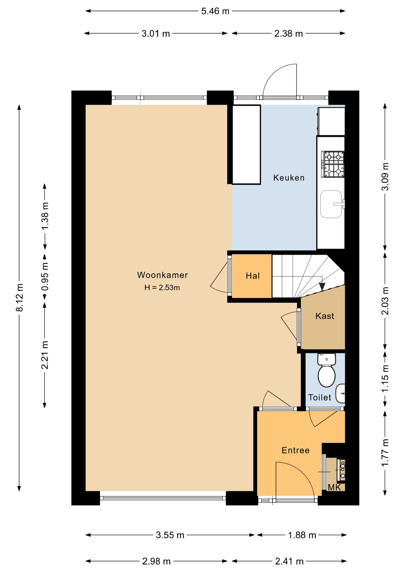 Entree/hal met de meterkast, toiletruimte en toegang tot de woonkamer. Ruime straatgerichte woonkamer met grote raampartijen, een fraaie laminaatvloer (2024), een praktische trapkast en een tussen portaal met de trapopgang naar de verdieping. Ruime opstelmogelijkheden voor een grote eettafel waar u heerlijk met vrienden en familie kunt dineren. Aan de achterzijde bevindt zich de fraaie inbouwkeuken (2017), welke voorzien is van de volgende apparatuur; koelkast, combi-oven, vaatwasser, 4-pits gaskookplaat en een afzuigkap. Vanuit de keuken is middels een deur de tuin te bereiken.