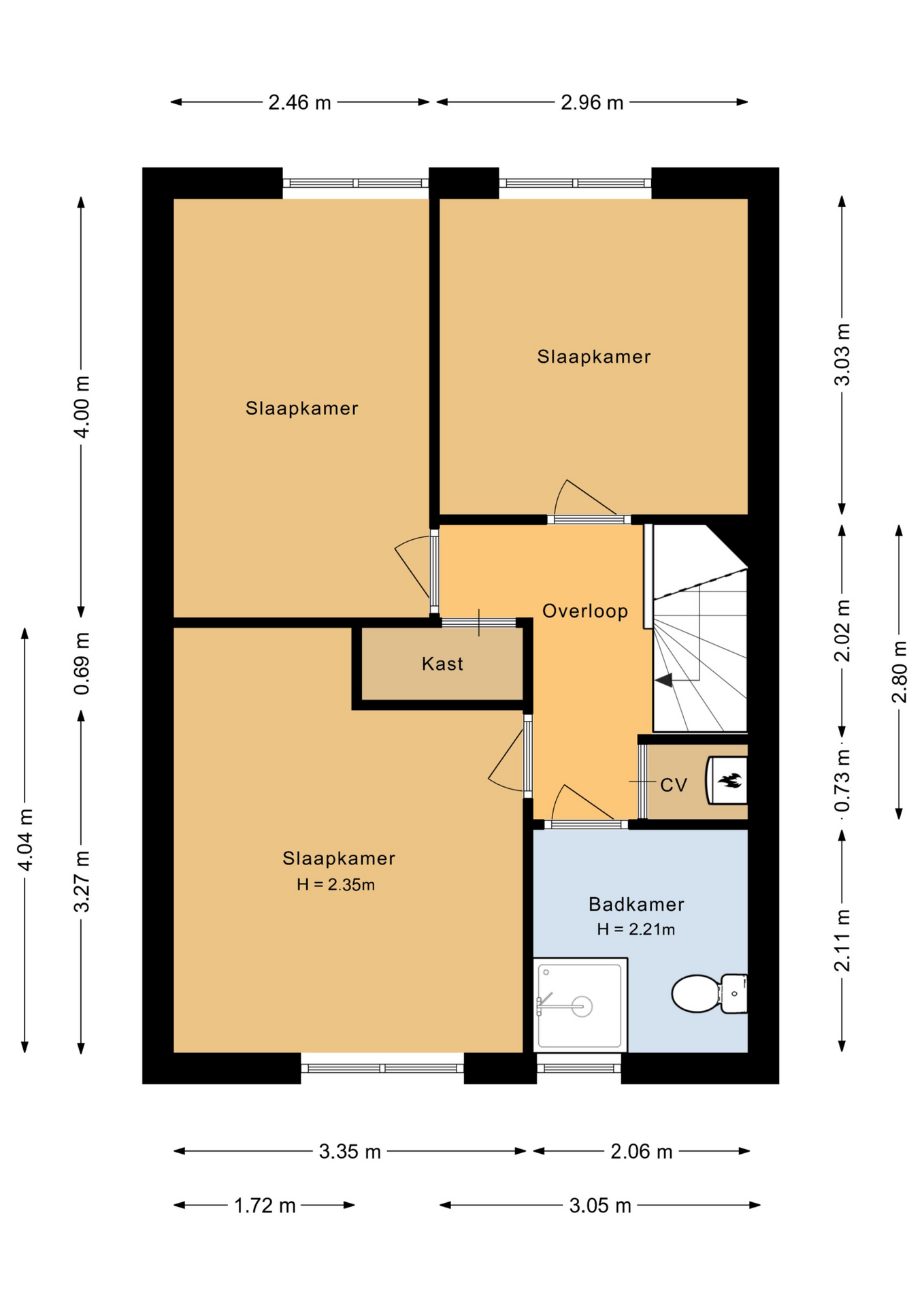 Overloop met bergkast en toegang tot 3 ruime slaapkamers (ca. 12 / 10 / 9 m2). Technische ruimte met de opstelplaats van de cv-ketel (2019) en veel praktische bergruimte. Keurige badkamer voorzien van een douche, 2e toilet, wastafel, de wasmachineaansluiting, een radiator en raam voor de natuurlijke ventilatie. De verdieping is voorzien van een laminaatvloer (2017).