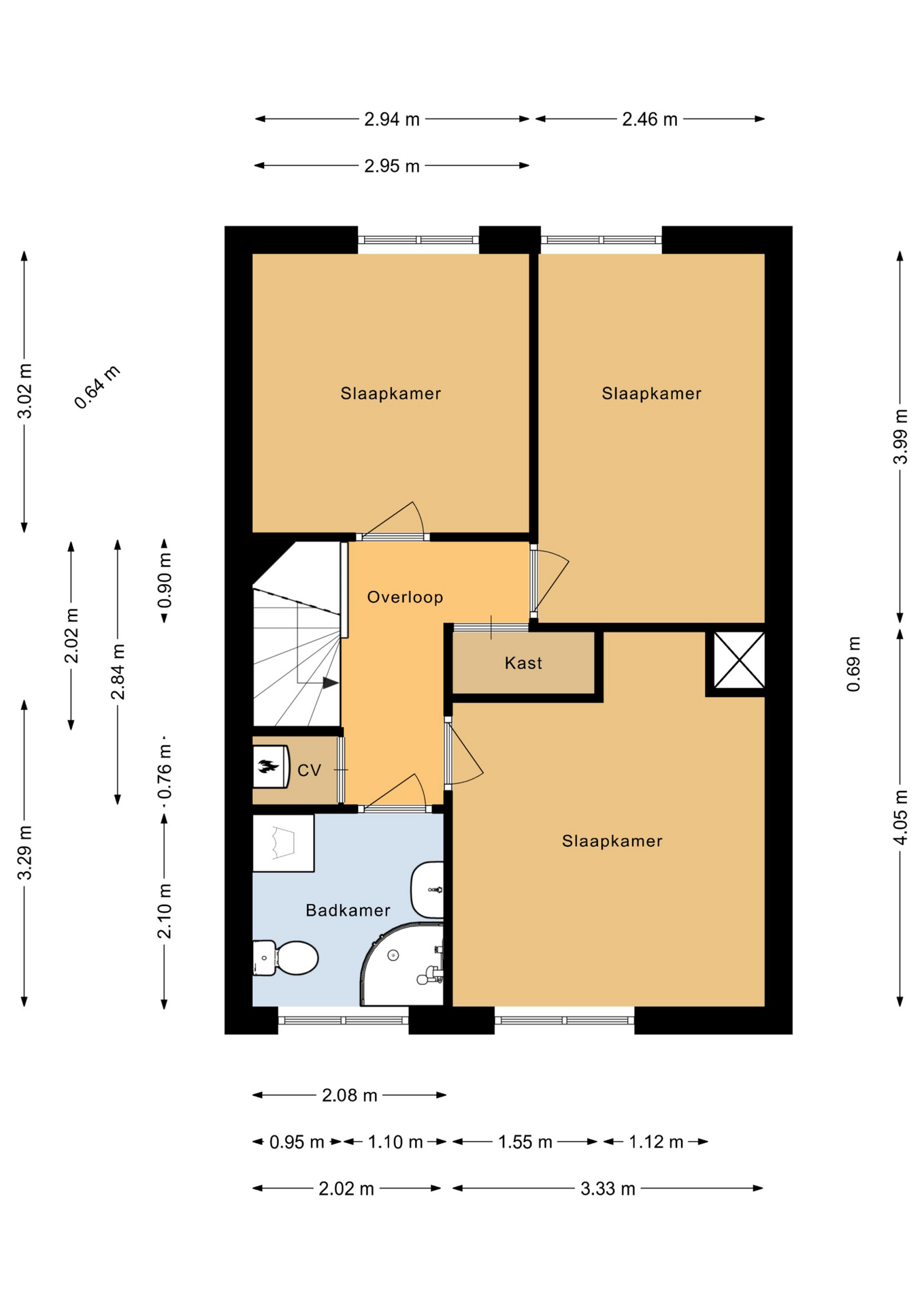 Overloop met aparte bergruimte en aparte kast met CV-opstelling, slaapkamer 1 (ca. 13 m²), slaapkamer 2 (ca. 10 m²), slaapkamer 3 (ca. 9 m²), badkamer voorzien van toilet, wastafel, douche, opstelling wasmachine en natuurlijke ventilatie.