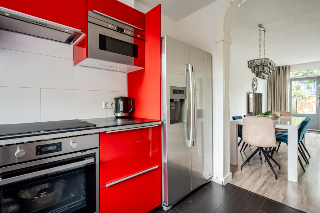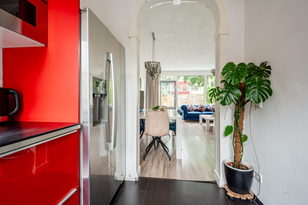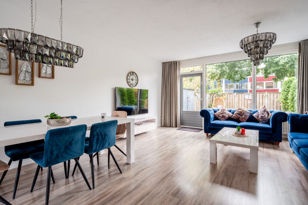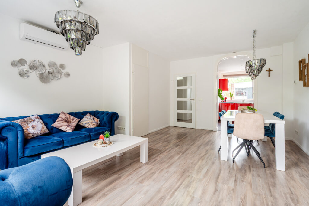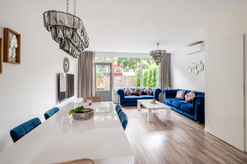 Entree/hal met de meterkast, toiletruimte, garderobe, trapopgang naar de verdieping en toegang naar de woonkamer. Een heerlijke tuingerichte woonkamer met grote raampartijen (veel lichtinval), een praktische bergkast, airco (2021 | warmte/koelen en een deur naar de tuin. Ruime opstelmogelijkheden voor een eettafel, waar u heerlijk met vrienden en familie kunt dineren. Aan de voorzijde bevindt zich de fraaie inbouwkeuken (2014), welke voorzien is van de volgende apparatuur; vaatwasser, oven, magnetron, Quooker, 4-pits inductiekookplaat, afzuigkap en een losse Amerikaanse koelkast. De begane grond is grotendeels voorzien van een fraaie laminaatvloer en de keuken is voorzien van een moderne zwarte tegelvloer.