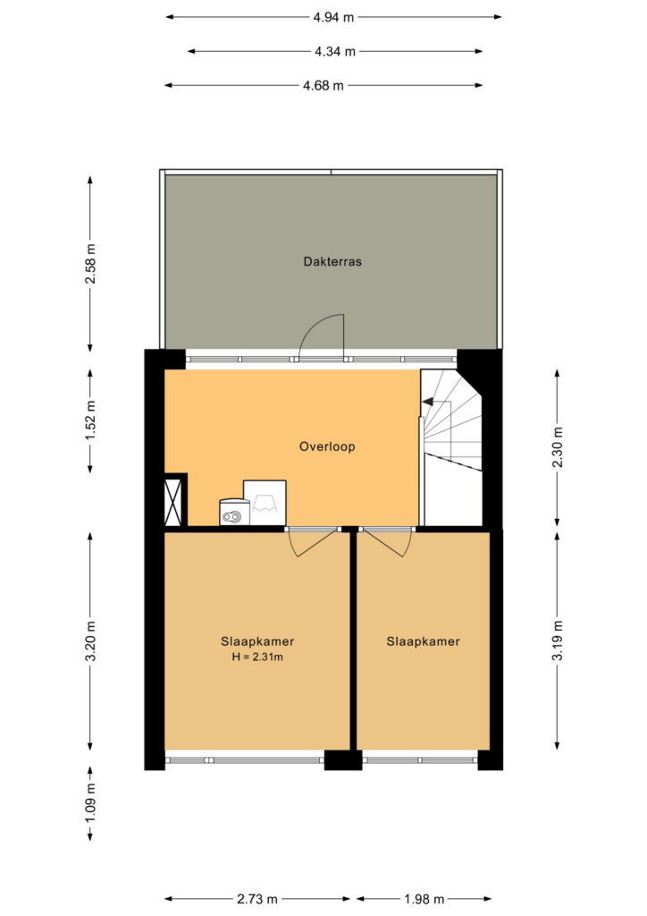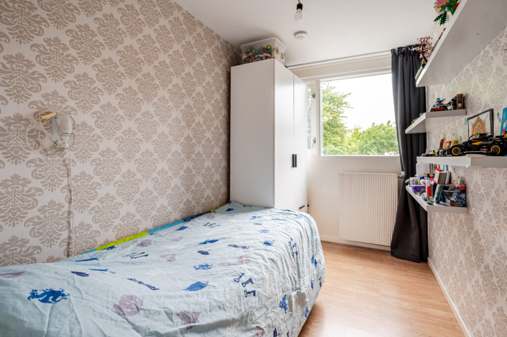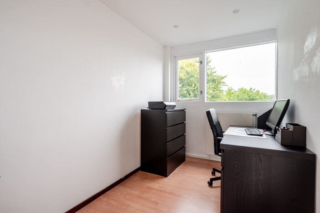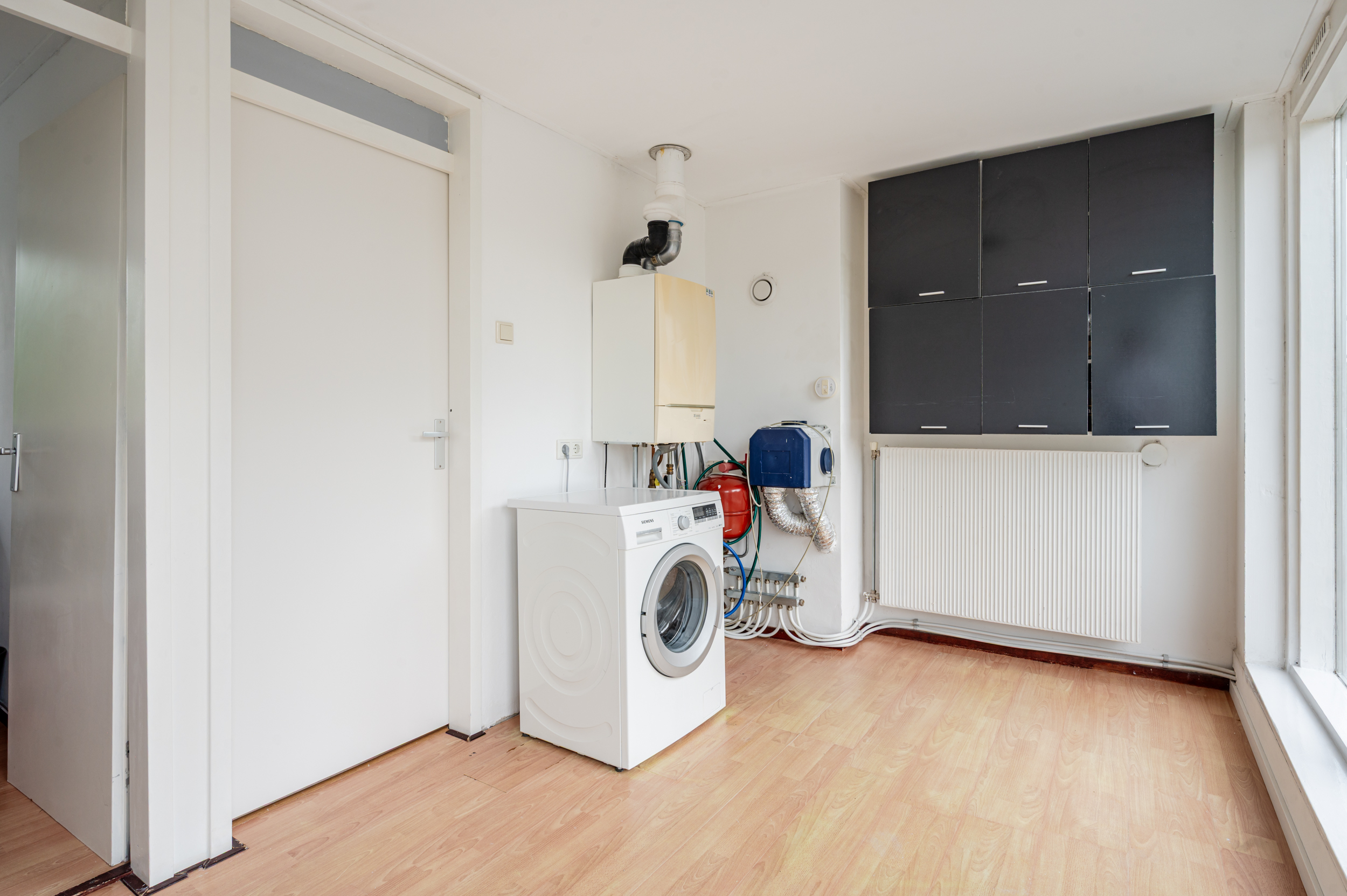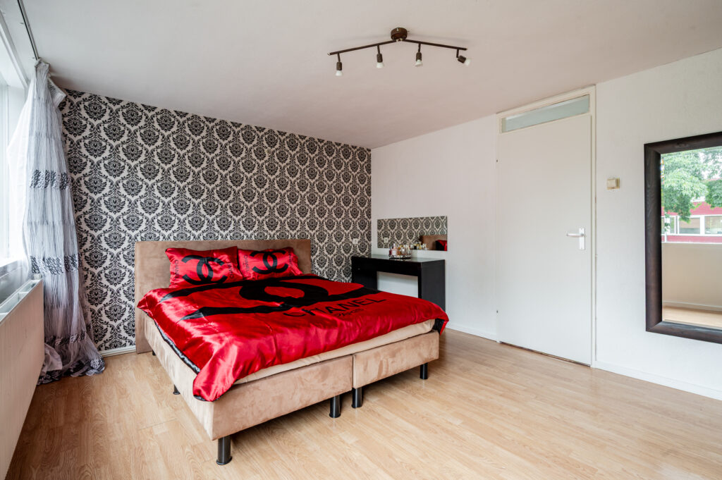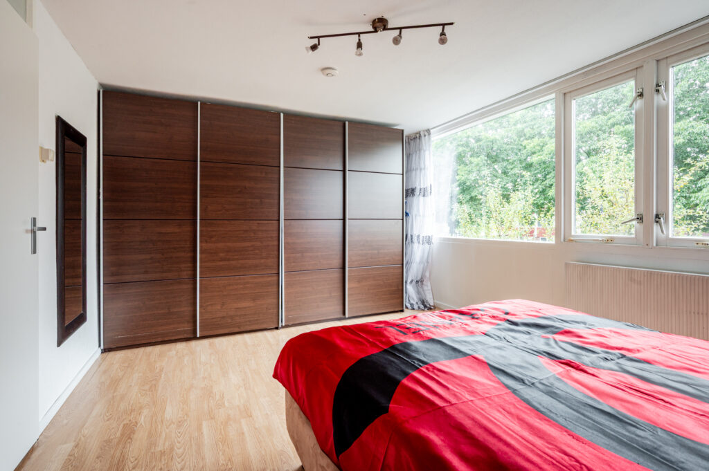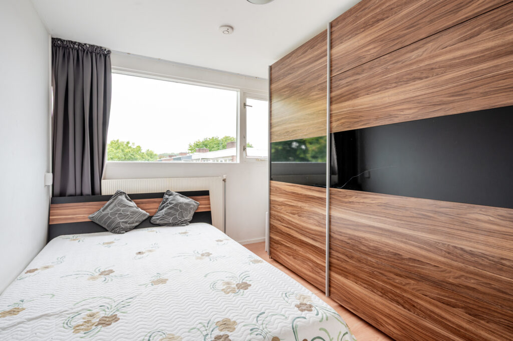 Overloop met de opstelplaats van de cv-ketel (2015), de mechanische ventilatie box (2018), de wasmachine/droger opstelling en toegang tot 2 ruime slaapkamers (ca. 9 en 6 m2). Deur met toegang naar het dakterras (ca. 13 m2) met een ligging op het zuiden en een fraai uitzicht over de wijk. De verdieping is voorzien van een mooie laminaatvloer.