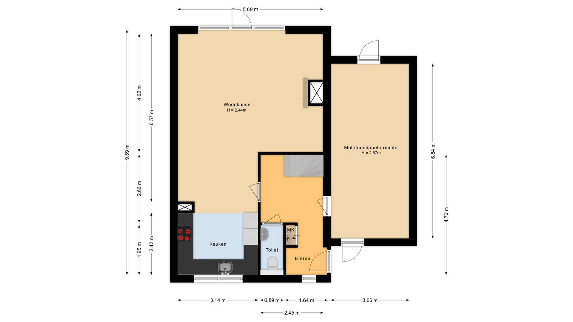 Entree/hal met de meterkast, toiletruimte (2014), trapopgang naar de verdieping en toegang tot de woonkamer en de garage/praktijkruimte. Ruime tuingerichte woonkamer (5.69 m. breed) met een sfeervolle open haard, grote raampartijen en middels een deur toegang tot de verzorgd aangelegde tuin met een ligging op het zuidwesten! Ruime opstelmogelijkheden voor een grote eettafel waar u heerlijk met uw familie kunt dineren. Aan de voorzijde bevindt zich de fraaie inbouwkeuken (2005) in U-opstelling, welke voorzien is van de volgende apparatuur; koelkast, vriezer, vaatwasser, stoomoven, combimagnetron, een 5-pits inductiekookplaat en een afzuigkap. De inbouwapparatuur is vernieuwd in 2022 en is voorzien van energielabel AAA. Vanuit de hal is de garage/praktijkruimte (met eigen entree) te bereiken, welke is voorzien van een wastafel en een deur naar de tuin. Deze ruimte is geschikt voor een bedrijf aan huis, maar kan ook worden omgebouwd tot een slaapkamer en badkamer, waardoor levensloopbestendig wonen tot de mogelijkheden behoort. De begane grond is voorzien een fraaie houten vloer.