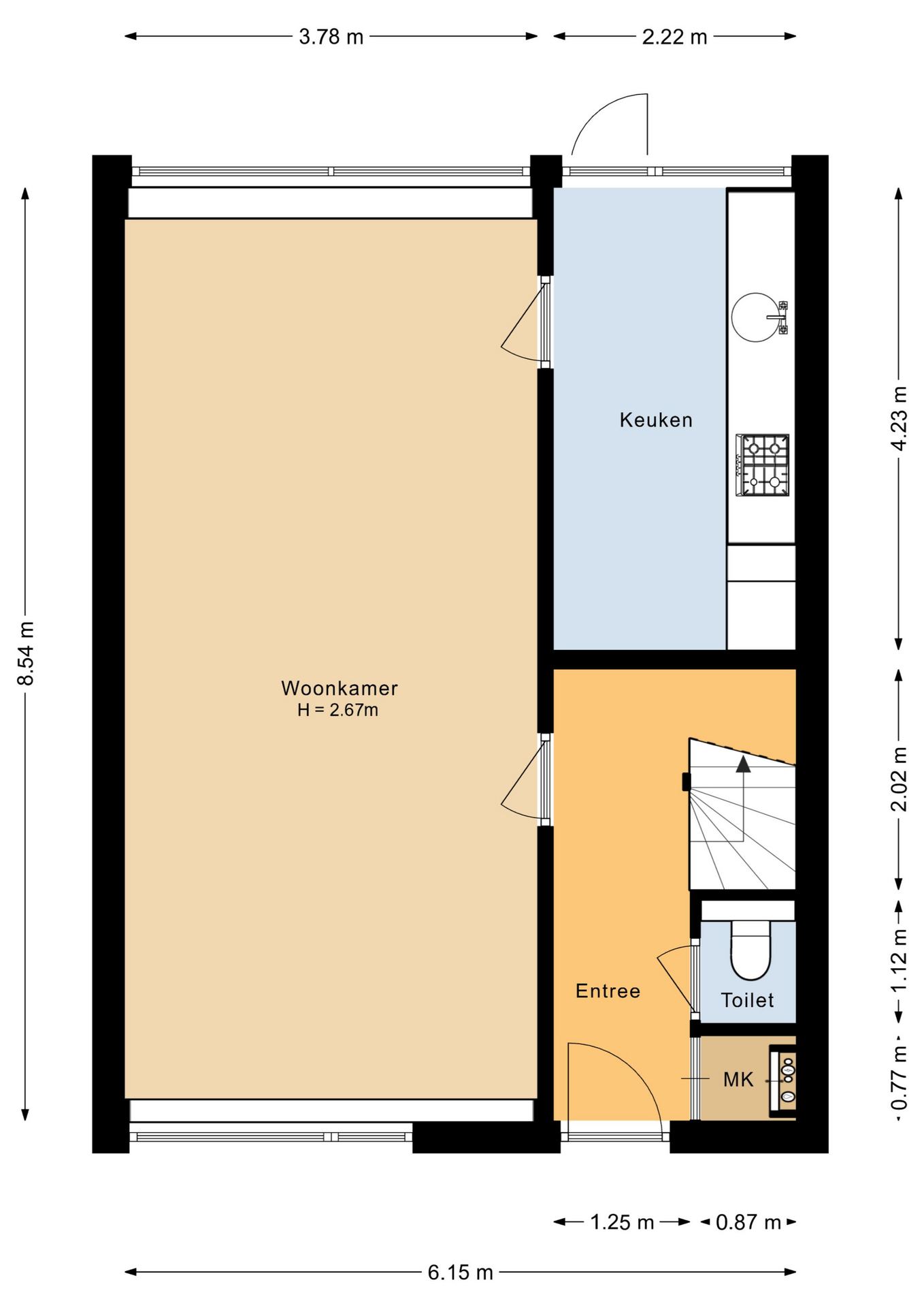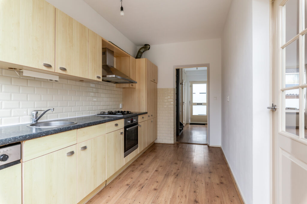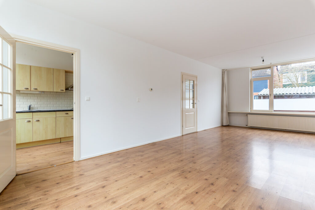 Entree/hal met de meterkast, moderne toiletruimte, trapopgang naar de verdieping, de wasmachine/droger aansluiting (onder de trap) en toegang naar de keuken en woonkamer. Een heerlijke ruime woonkamer van ca. 32 m2, welke zowel tuingericht alsmede straatgericht kan worden ingericht. De woonkamer is voorzien van grote raampartijen met veel lichtinval en biedt ruime opstelmogelijkheden voor een grote eettafel, waar u heerlijk met vrienden en familie kunt dineren. Aan de achterzijde bevindt zich de inbouwkeuken, welke voorzien is van de volgende apparatuur; koelkast, vaatwasser (defect), oven, 4-pits gaskookplaat en een afzuigkap. De begane grond is voorzien van een laminaatvloer.