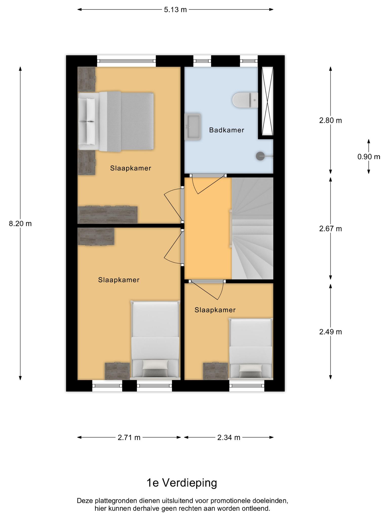 Overloop, slaapkamer 1 (ca. 6 m²), slaapkamer 2 (ca. 10 m²), slaapkamer 3 (ca. 11 m²), moderne badkamer voorzien wastafel, inloopdouche, hangend toilet en een vaste kast.