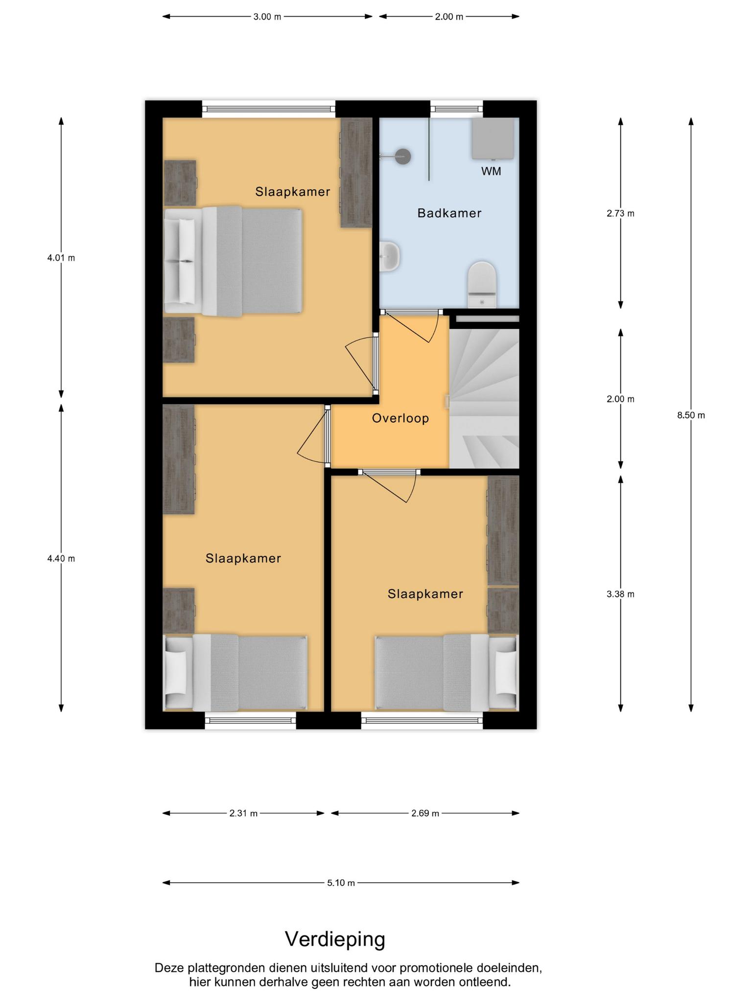 Overloop met toegang tot 3 ruime slaapkamers (ca. 12 / 10 / 9 m2). Badkamer met een (inloop)douche, 2e toilet, wastafel, de wasmachineaansluiting, radiator en een raam voor de natuurlijke ventilatie. De verdieping is voorzien van een laminaatvloer.