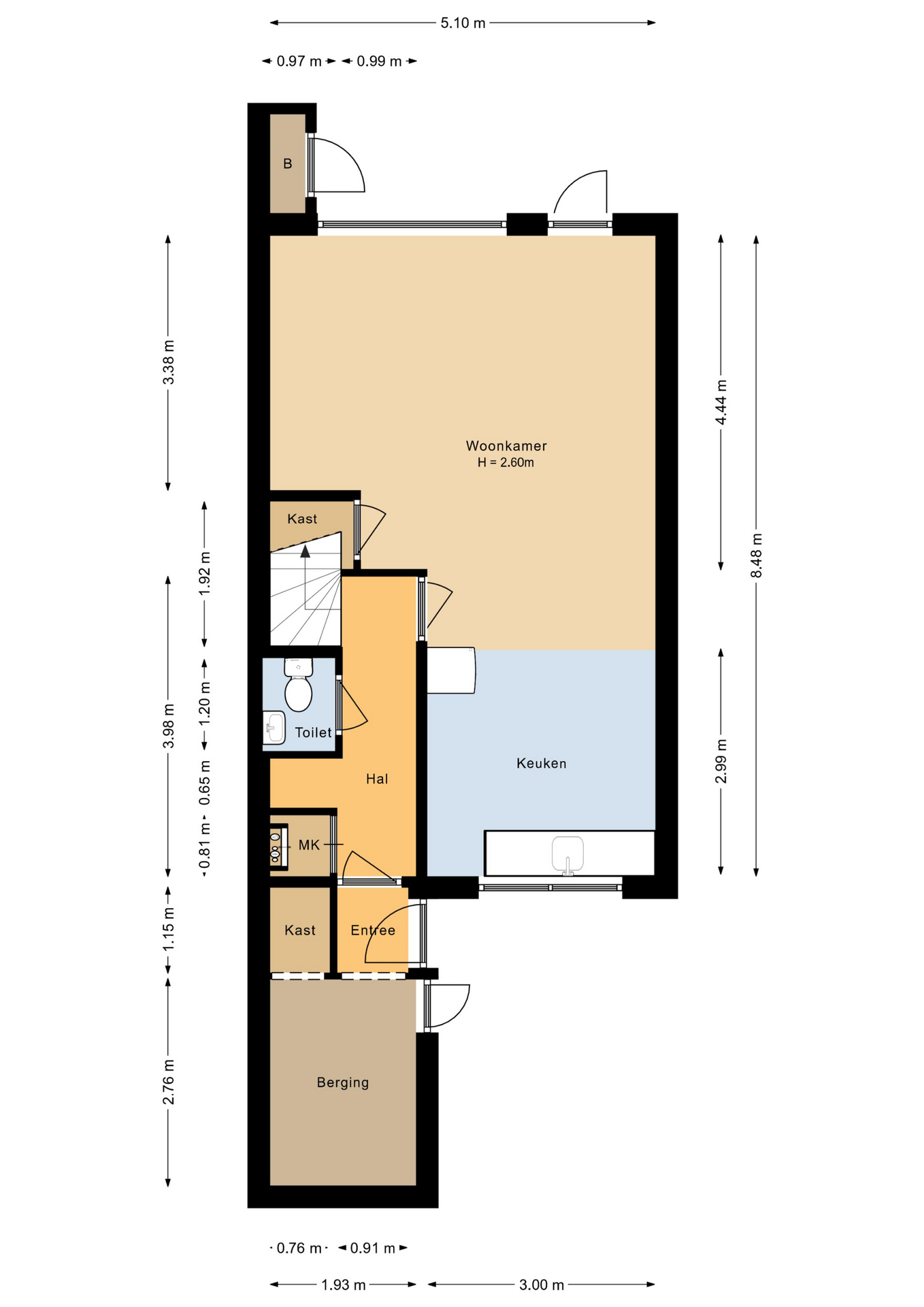 Entree, hal, toilet met fonteintje, lichte en ruime woonkamer (ca. 20 m²) met trapkast, open straatgerichte keuken, aangebouwde berging (ca. 5 m²).