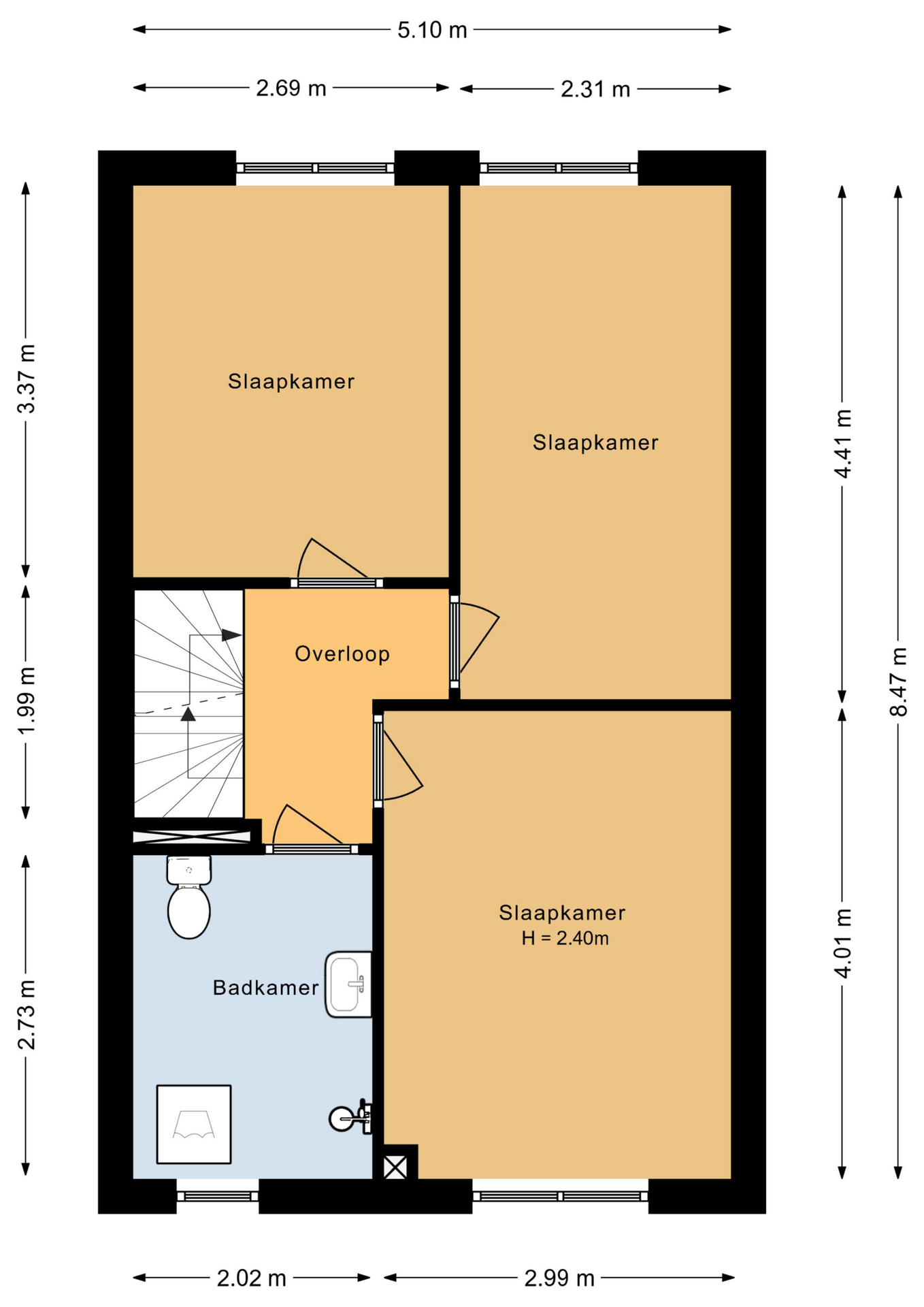 Overloop, slaapkamer 1 (ca. 12 m²) aan de voorzijde, slaapkamer 2 (ca. 10 m²) aan de achterzijde, slaapkamer 3 (ca. 9 m²), badkamer voorzien van wastafel, douche, toilet en opstelling wasmachine.