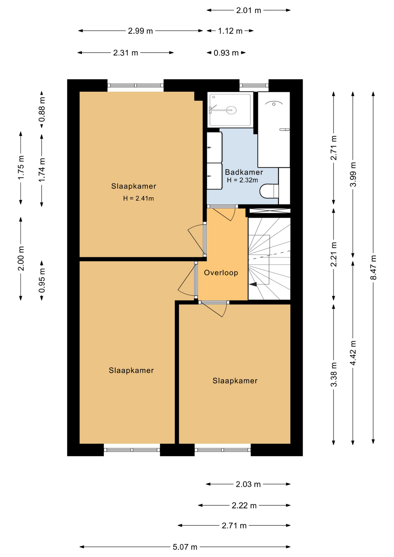 Overloop met toegang tot 3 ruime slaapkamers (ca. 12 / 11 / 9 m2), waarbij de 2 slaapkamers aan de achterzijde uitzicht geven over het bos! Moderne badkamer (2013) met een ligbad, (inloop)douche, 2e toilet, wastafelmeubel, vloerverwarming en een raam voor voor de natuurlijke ventilatie. De verdieping is voorzien van een mooie laminaatvloer.