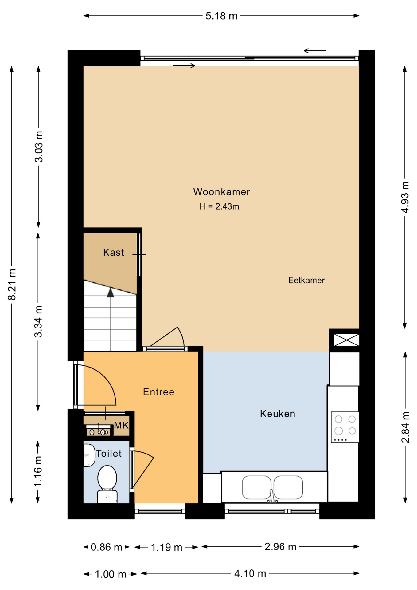 Entree/hal met de meterkast, toiletruimte, trapopgang naar de verdieping en deur naar de woonkamer. Ruime tuingerichte woonkamer met een trapkast en middels een schuifpui toegang naar de tuin. Aan de voorzijde bevindt zich de nette inbouwkeuken in L-opstelling, welke voorzien is van de volgende inbouwapparatuur; koelkast, vriezer, vaatwasser, oven, 4-pits gaskookplaat en een afzuigkap. Ruime opstelmogelijkheden voor een grote eettafel waar u heerlijk met uw familie kunt dineren. De begane grond is voorzien van een laminaatvloer.