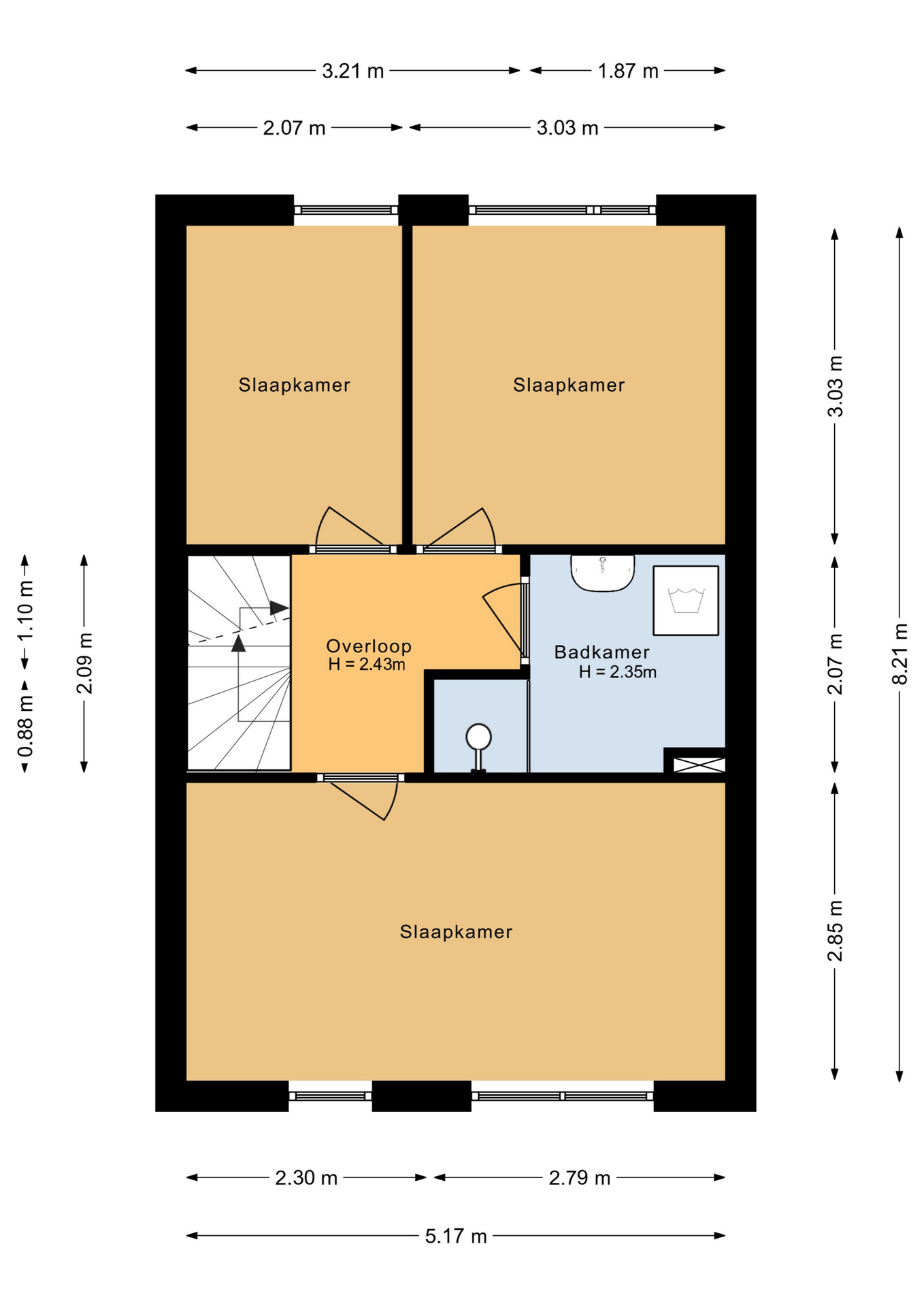 Overloop met toegang tot 3 in grootte variërende slaapkamers (ca. 15 / 9 / 6 m2), waarbij de ouderslaapkamer aan de voorzijde over de volle breedte van de woning. Keurige badkamer met een douche, wastafel, de wasmachineaansluiting, een designradiator en voorbereidingen voor het plaatsen van een 2e toilet. De verdieping is voorzien van vloerbedekking.