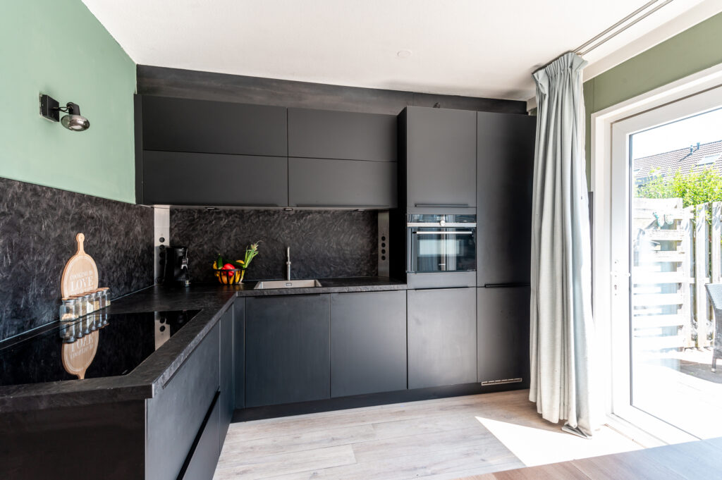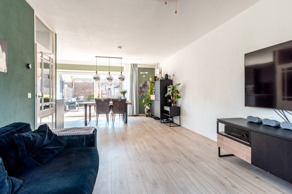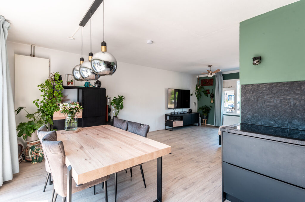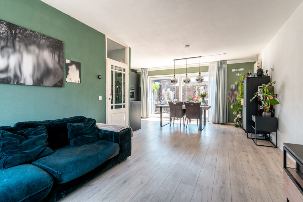 Entree/hal met de meterkast (2022), moderne toiletruimte met fonteintje, trapopgang naar de verdieping en toegang tot de woonkamer. Ruime straatgerichte woonkamer met grote raampartijen (veel lichtinval!) en aan de achterzijde bevindt zich de luxe inbouwkeuken (2022) welke voorzien is van de volgende inbouwapparatuur; koel-vriescombinatie, vaatwasser, combi-oven, brede inductiekookplaat met geïntegreerde afzuigkap en een handige Quooker kraan. Ruime opstelmogelijkheden voor een grote eettafel waar u heerlijk met uw familie kunt dineren. Vanuit de keuken is middels een grote kunststof schuifpui de achtertuin te bereiken. De begane grond is voorzien van een nette laminaatvloer.