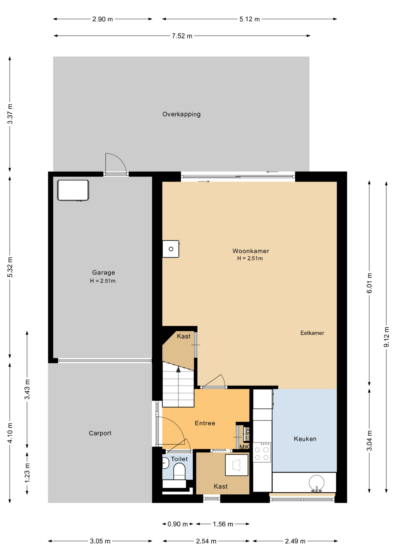 Entree/hal met de toiletruimte, meterkast, wasruimte, trapopgang naar de verdieping en toegang naar de woonkamer. Een heerlijke ruime woonkamer van 5.12 meter breed, voorzien van een sfeervolle gaskachel (ter overname), een praktische trapkast en een aluminium schuifpui naar de luxe aangebouwde serre. Hier kunt u heerlijk vertoeven op elk gewenst moment van de dag! Aan de voorzijde bevindt zich de nette inbouwkeuken (2005) in hoekopstelling, welke voorzien is van de volgende apparatuur; koelkast, oven, magnetron, vaatwasser, 4-pits kookplaat en een afzuigkap. Ruime opstelmogelijkheden voor een eettafel waar u heerlijk met uw familie kunt dineren. De begane grond is grotendeels voorzien van een fraaie houten vloer.