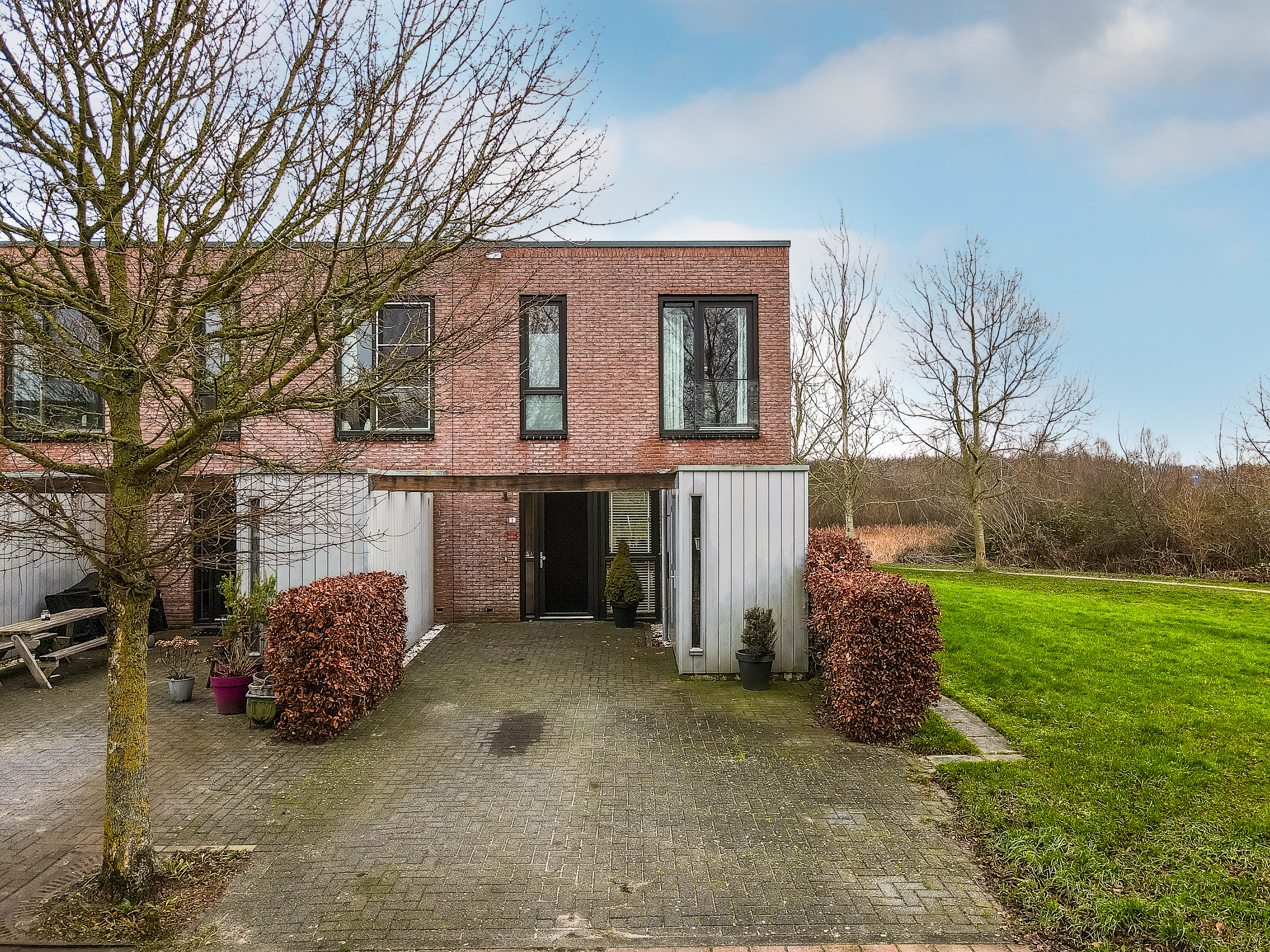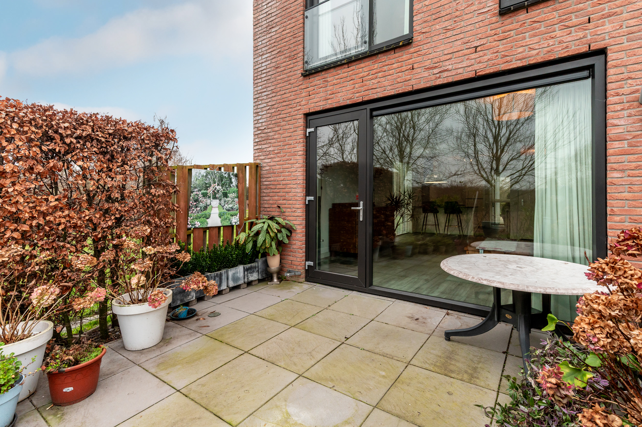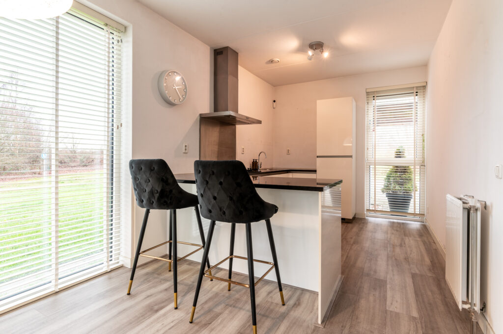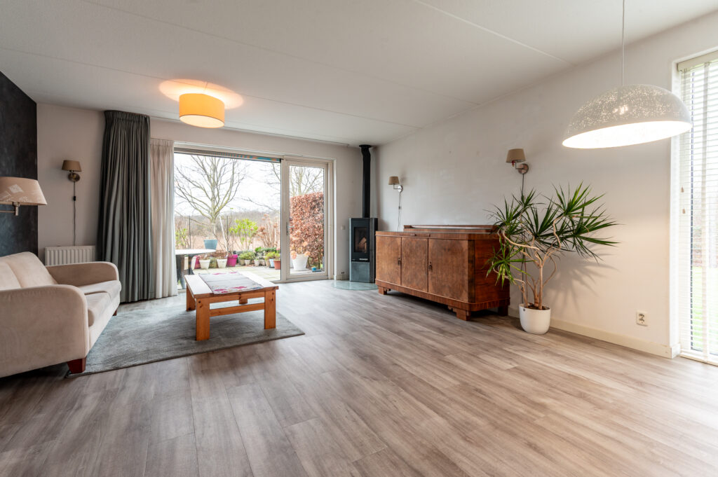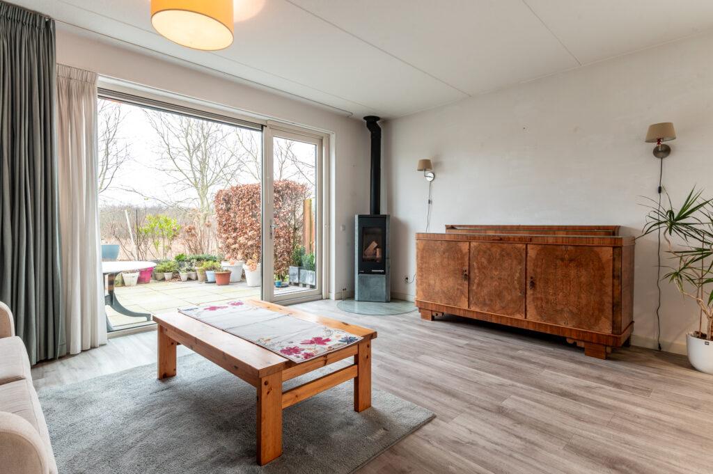 * Vanuit de woonkamer kijkt u heerlijk vrij weg dankzij de grote glazen pui en het extra zijraam