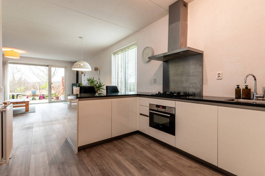 Entree/hal met de meterkast, toiletruimte, trapopgang naar de verdieping en toegang tot de woonkamer. Ruime tuingerichte woonkamer van 5.11 meter breed met grote raampartijen, een sfeervolle speksteen houtkachel (2016), een praktische bergkast en een deur naar de tuin. Vanuit de woonkamer kijkt u door de grote glazen pui aan de achterzijde en het extra zijraam heerlijk vrij weg over het natuurgebied! Aan de voorzijde bevindt zich de fraaie inbouwkeuken met granieten werkblad, welke in 2020 is voorzien van de volgende vernieuwde apparatuur; koelkast, vriezer, vaatwasser, combioven, 4-pits gaskookplaat en een afzuigkap. Ruime opstelmogelijkheden voor een grote eettafel waar u heerlijk met uw familie kunt dineren. De begane grond is voorzien van een fraaie PVC-vloer.