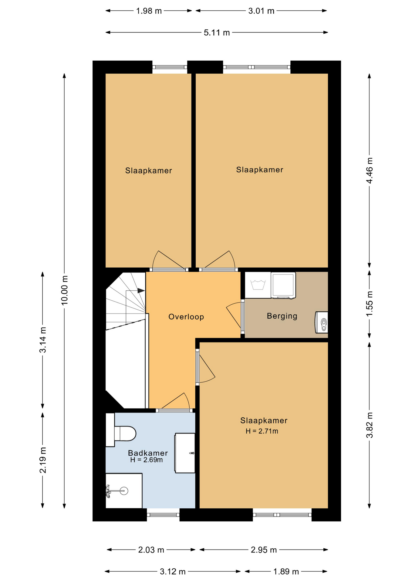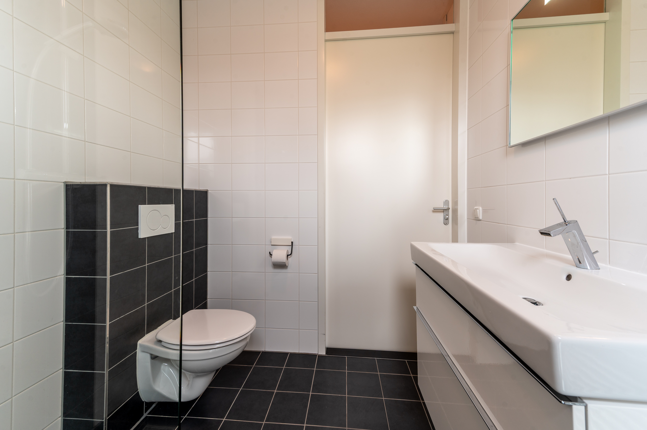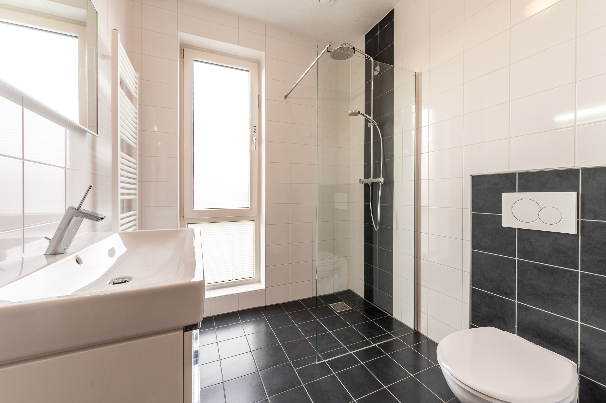 Overloop met toegang tot 3 ruime slaapkamers (ca. 13 / 11 / 9 m2), waarbij de 2 grootste slaapkamers zijn uitgevoerd met een Frans balkon. Moderne badkamer met een inloopdouche, 2e toilet, wastafelmeubel, een radiator en een raam voor de natuurlijke ventilatie. Technische ruimte met de opstelplaats van de cv-ketel, de mechanische ventilatie box, de wasmachine/droger aansluiting en veel praktische bergruimte. De verdieping is voorzien van vloerbedekking.