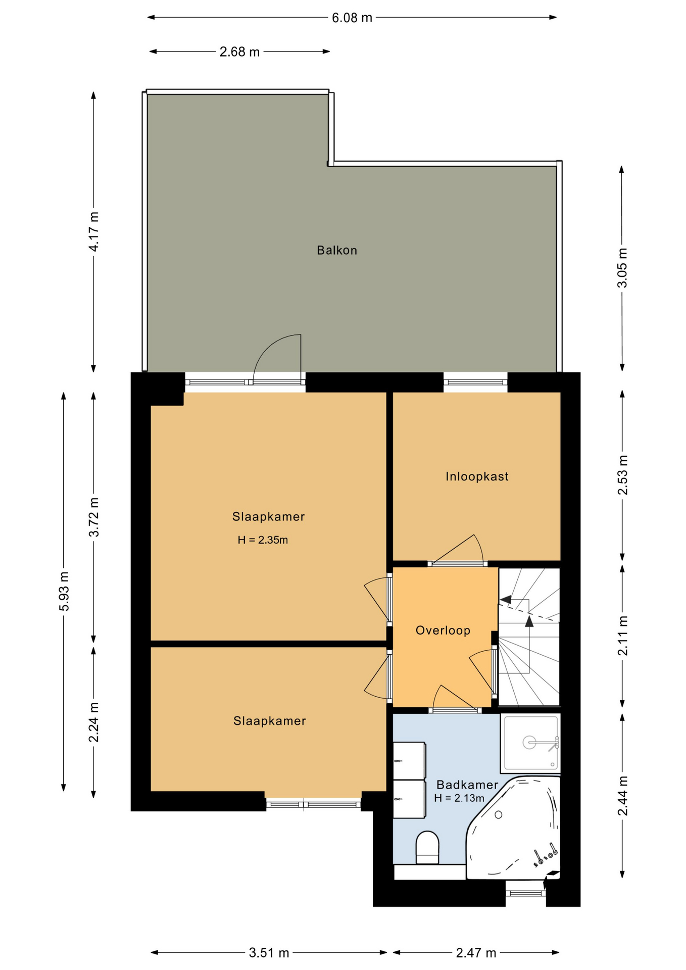 Overloop, slaapkamer 1 (ca. 13 m²) met toegang naar het royale dakterras (ca. 22 m²), slaapkamer 2 (ca. 8 m²), slaapkamer 3 (ca. 6 m²), badkamer voorzien van dubbele wastafel met meubel, toilet, douche, ligbad en natuurlijke ventilatie.