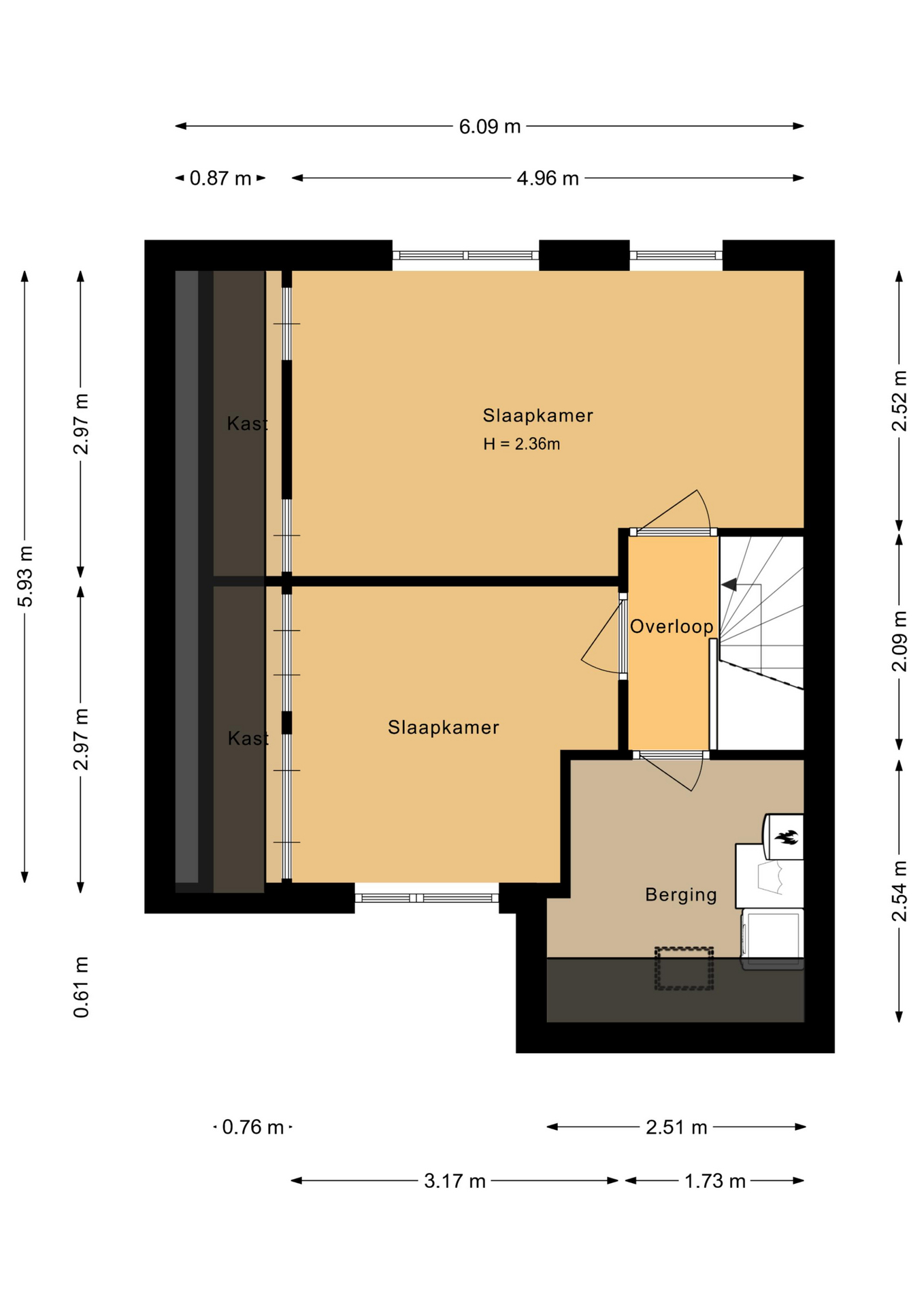 De tweede verdieping herbergt nog eens twee slaapkamers, beide voorzien van praktische vaste kasten. Deze etage is daarnaast voorzien van een aparte ruimte waar zich de opstelling voor de CV-ketel bevindt, evenals aansluitingen voor wasmachine en droger, en de omvormer – ideaal voor het efficiënt organiseren van het huishouden.
