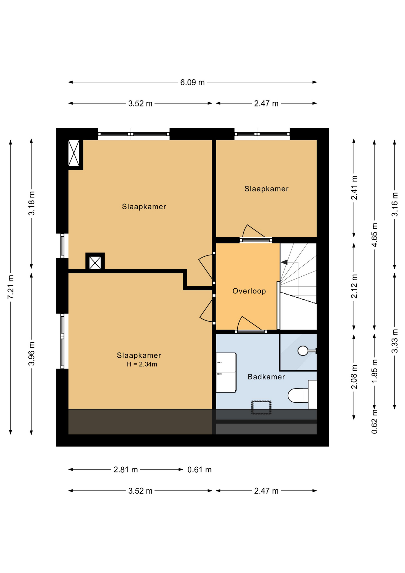 Overloop met toegang tot 3 ruime slaapkamers (ca. 12 / 11 / 6 m2). Moderne badkamer (2021) met een (inloop)douche, 2e toilet, wastafelmeubel met dubbele kraan, designradiator en een raam voor de natuurlijke ventilatie. De verdieping is voorzien van een fraaie laminaatvloer (2021).