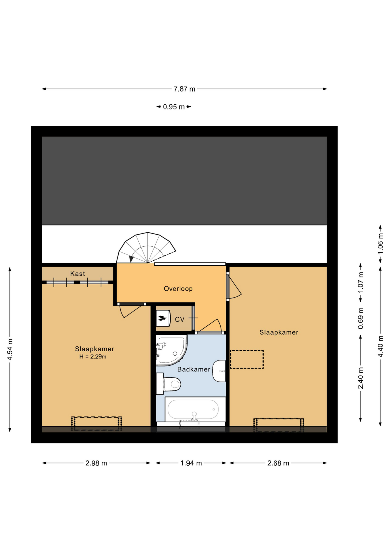 Eerste verdieping: Overloop met uitzicht over de woonkamer, twee ruime slaapkamers (respectievelijk ca. 12m2) met beiden een groot dakraam, waarvan één slaapkamer met ingebouwde kast, een keurige en volledig betegelde badkamer voorzien van een ligbad, douchecabine, wandcloset, wastafelmeubel, designradiator en een raam. Op de overloop is de aparte cv-ruimte te vinden.