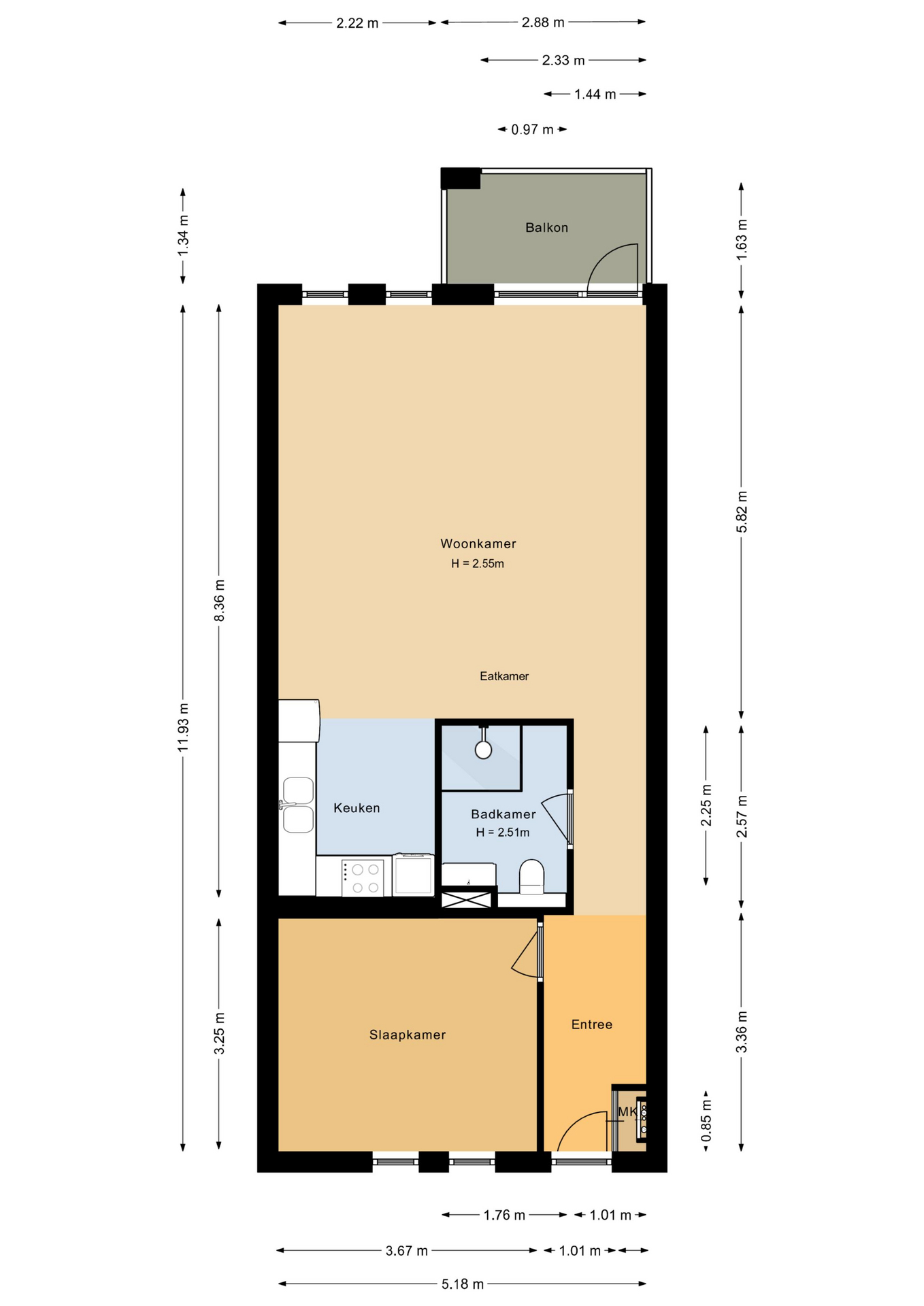 Entree/hal met de meterkast, garderobe en toegang tot diverse vertrekken. Ruime en sfeervolle woonkamer van 5,18 m. breed met grote raampartijen, een ingebouwde kastenwand en een deur met toegang naar het balkon (ca. 5 m2) met ligging op het oosten. Aangrenzend bevindt zich de nette inbouwkeuken in L-opstelling, welke voorzien is van een spoelbak, oven, 4-pits kookplaat, afzuigkap, een losse koel/vriescombinatie en de aansluiting voor de wasmachine. De keuken biedt verrassend veel kast- en werkruimte mede door de aanwezige bovenkastjes. Aan de voorzijde bevindt zich de ruime slaapkamer (ca. 12 m2), welke voldoende ruimte biedt voor een tweepersoonsbed en een grote kledingkast. Luxe badkamer (2024) met een inloopdouche, toilet, wastafelmeubel en een spiegel met verwarming. Het appartement is voorzien van een keurige laminaatvloer.