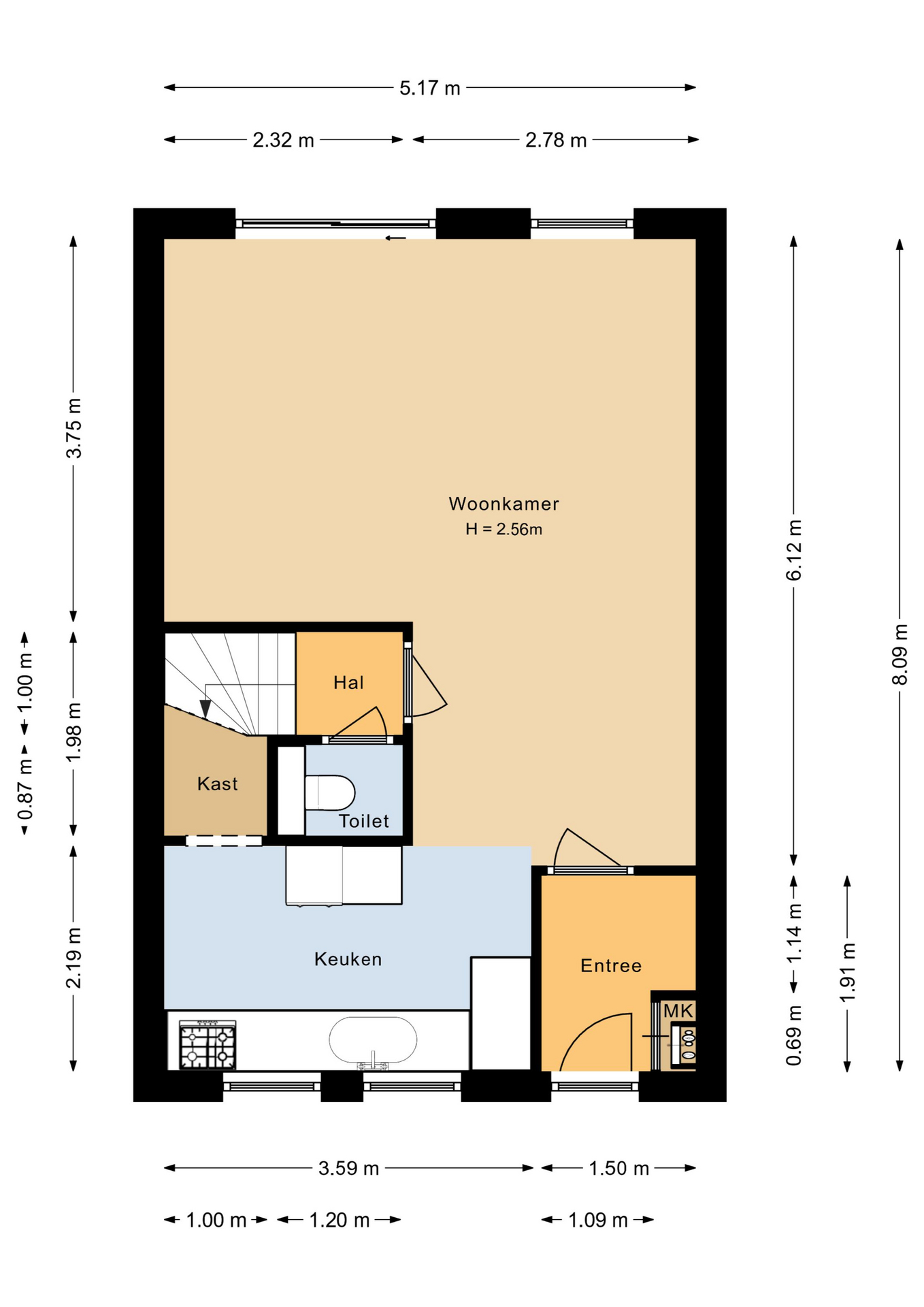 Entree, hal met garderobe nis, ruime en lichte woonkamer (ca. 24 m²) voorzien van schuifpui naar de achtertuin, half open keuken voorzien van diverse inbouwapparatuur, provisieruimte, tweede hal, modern toilet, trapopgang naar de eerste verdieping.