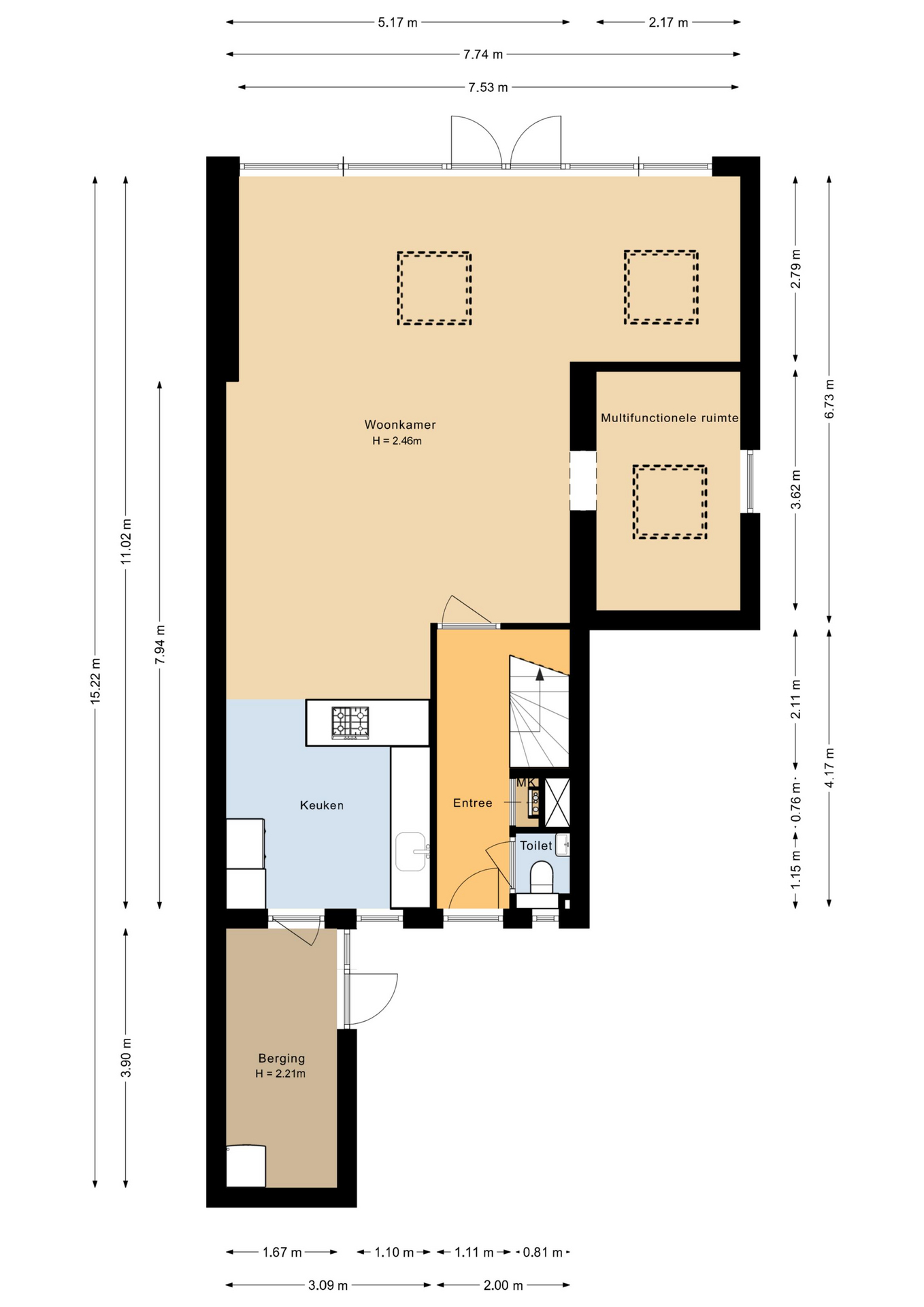 Begane grond: Entree/hal, toiletruimte met vrijhangend toilet en fonteintje, meterkast (2010), garderobe, trapopgang naar de verdieping en toegang tot de woonkamer. De fors uitgebouwde woonkamer is voorzien van openslaande deuren, grote raampartijen en lichtkoepels (veel lichtinval!) en is maar liefst 54 m² groot! En dan hebben we de kamer in gebruik als hobbyruimte nog niet eens meegeteld. Dit betreft een extra kamer die momenteel in gebruik is als hobbyruimte, maar die ook perfect kan dienen als kantoor of extra slaapkamer. Aan de voorzijde bevindt zich de ruime inbouwkeuken met een gezellige bar waar je gezellig kunt ontbijten of een praatje te maken tijdens het koken. De keuken is voorzien van een 5-pits gasfornuis met afzuigkap, inbouwoven, een combimagnetron, koelkast, vaatwasser en een handige plintboiler voor het warme water. Aangrenzend ligt de praktische bijkeuken met loopdeur naar buiten. Verder biedt de woonkamer voldoende ruimte voor een grote eettafel waar u heerlijk met uw familie kunt dineren. De begane grond is voorzien van een sfeervolle houten vloer.