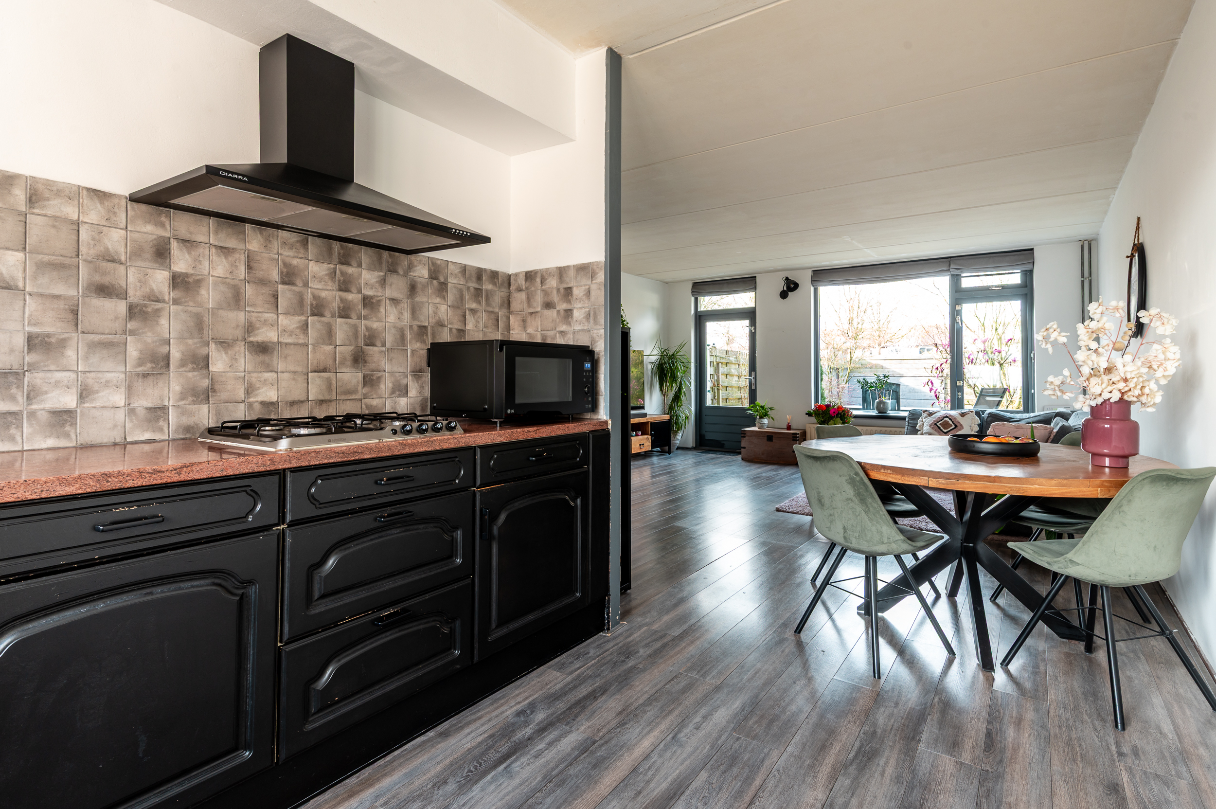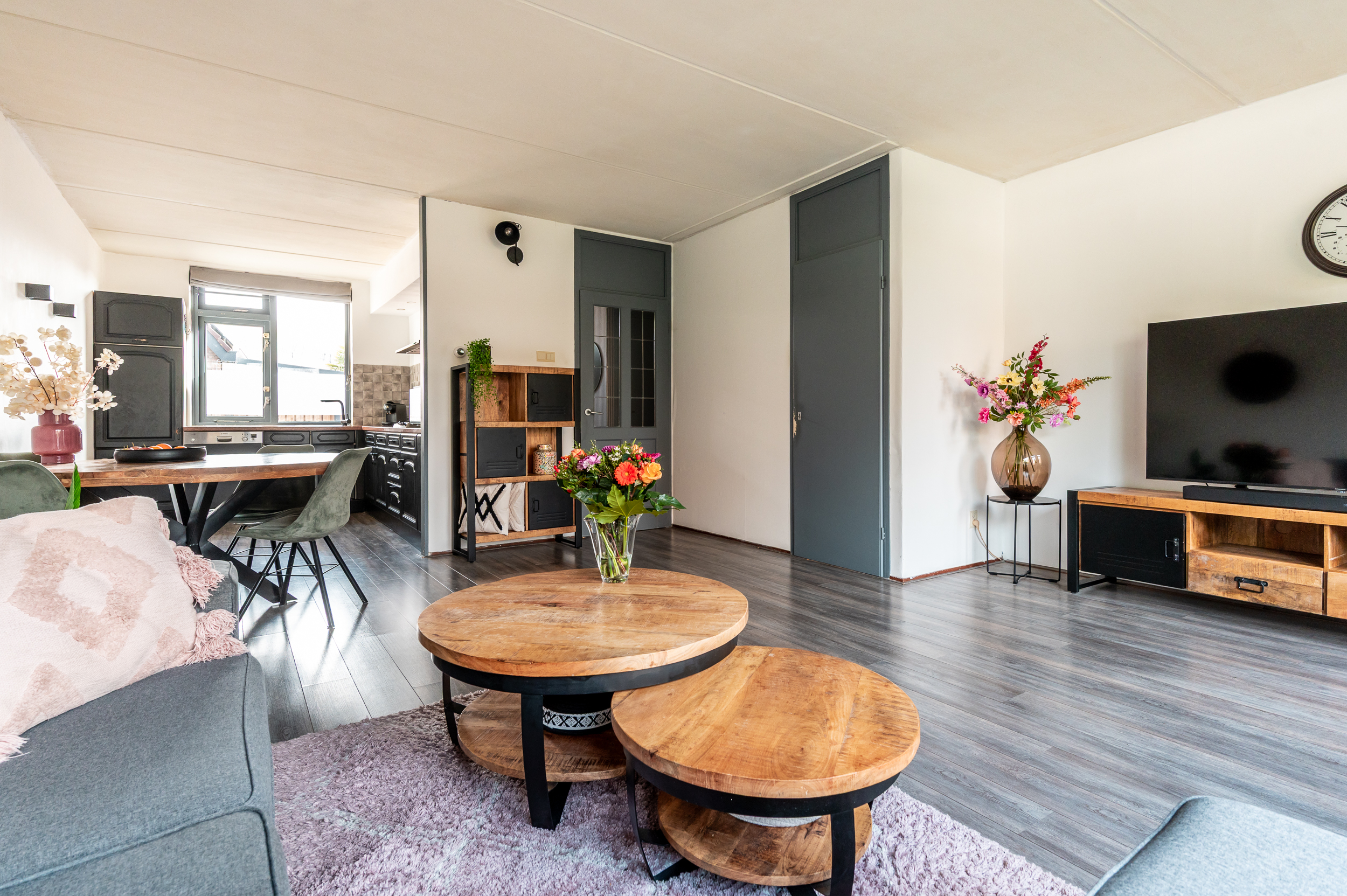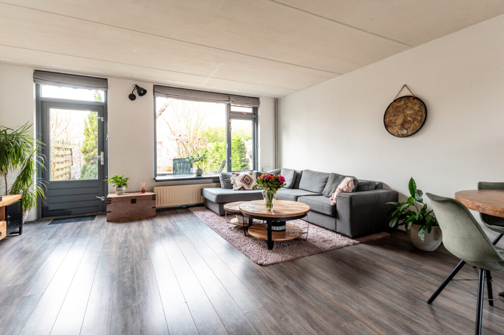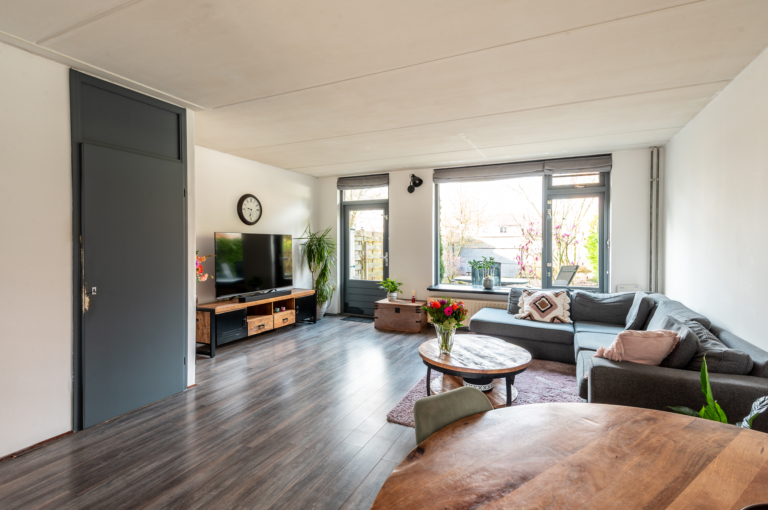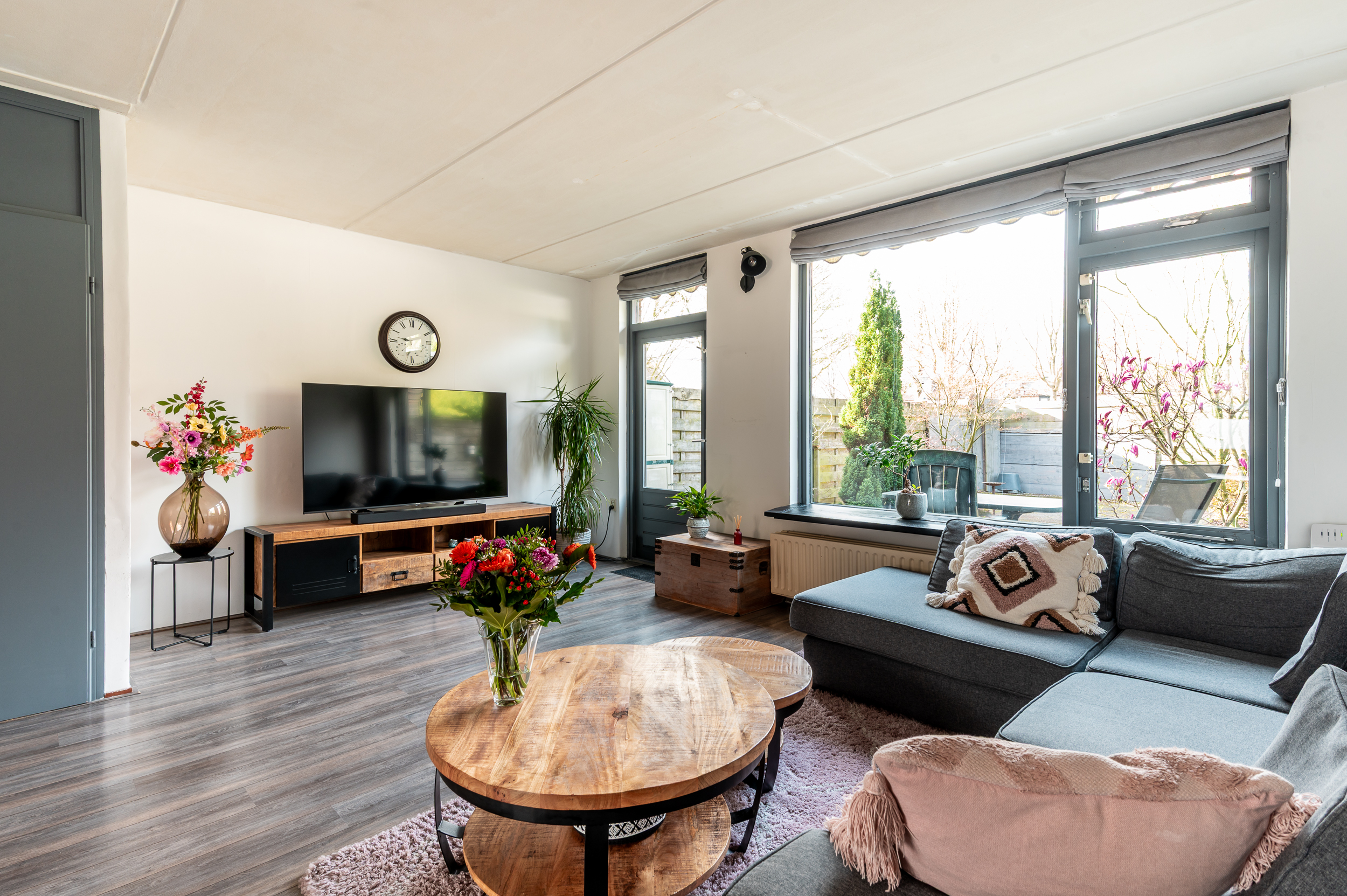 Bij binnenkomst wordt u verwelkomd in de hal met toilet en toegang tot de lichte, ruime woonkamer van circa 30 m². Dankzij de grote raampartijen en de directe verbinding met de achtertuin is dit een fijne, lichte leefruimte. De half open L-vormige keuken sluit hier mooi op aan en is voorzien van diverse inbouwapparatuur. Daarnaast beschikt de woning over een praktische aangebouwde berging, ideaal voor opslag of hobbyruimte.