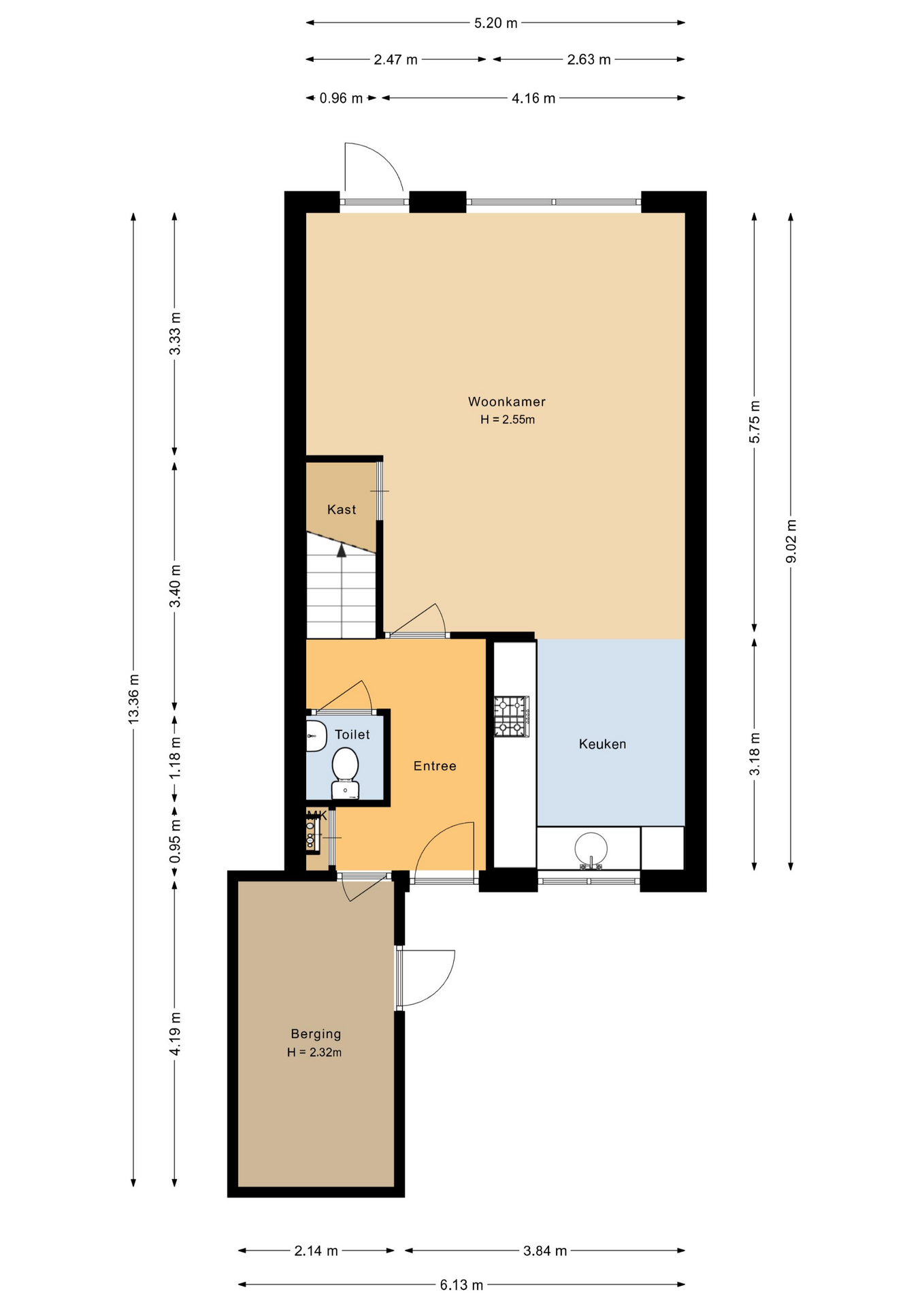 Entree, hal, toilet met fonteintje, lichte en ruime woonkamer (ca. 30 m²) met deur naar de tuin, trapkast, half open L-vormige keuken met diverse inbouwapparatuur. Vanuit de hal komt u terecht bij de aangebouwde berging (ca. 9 m²).