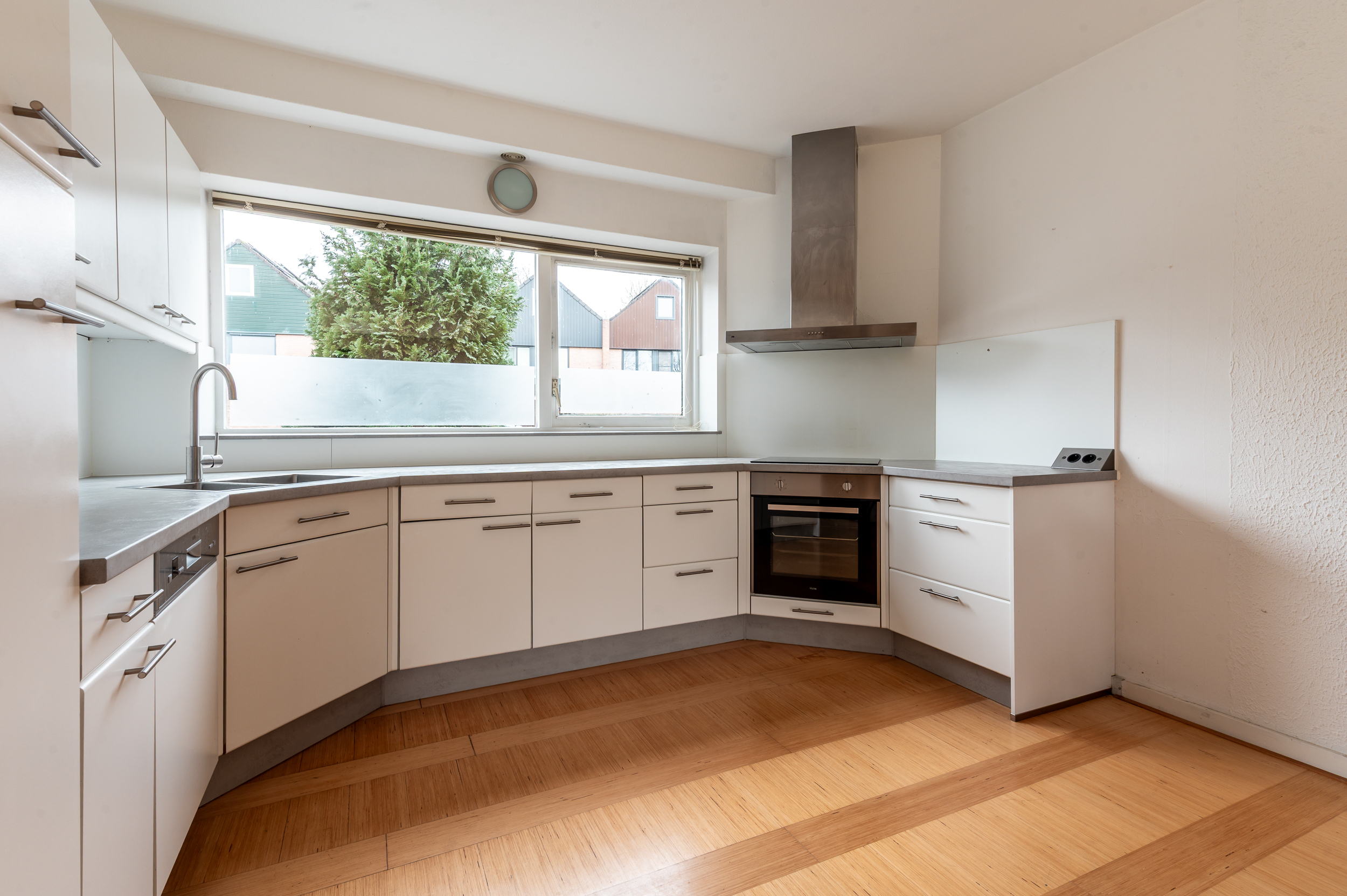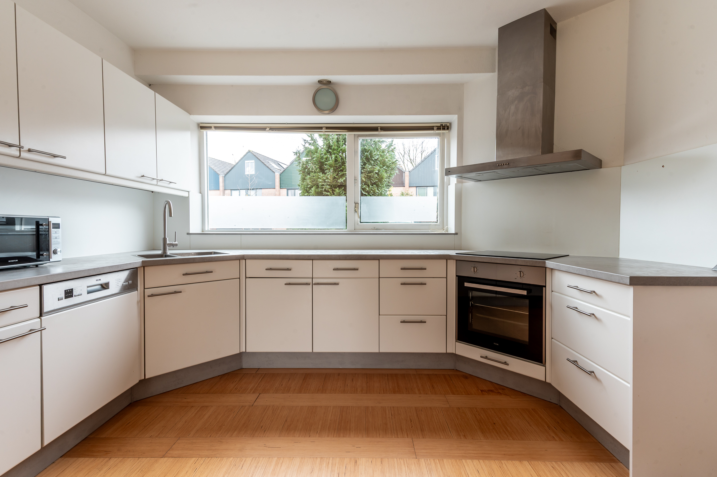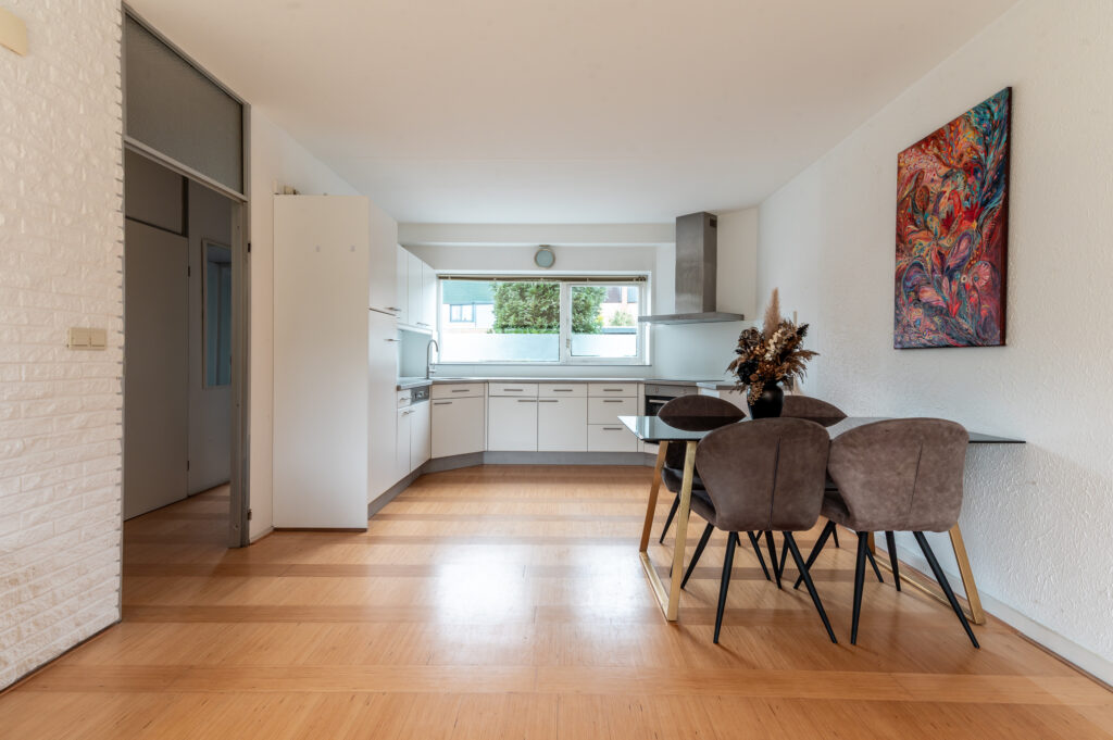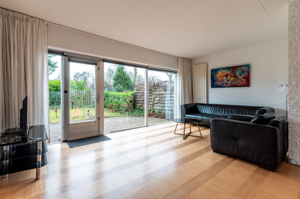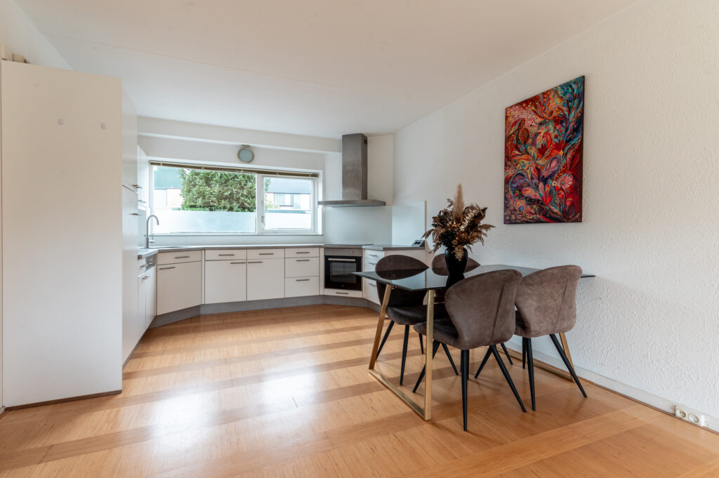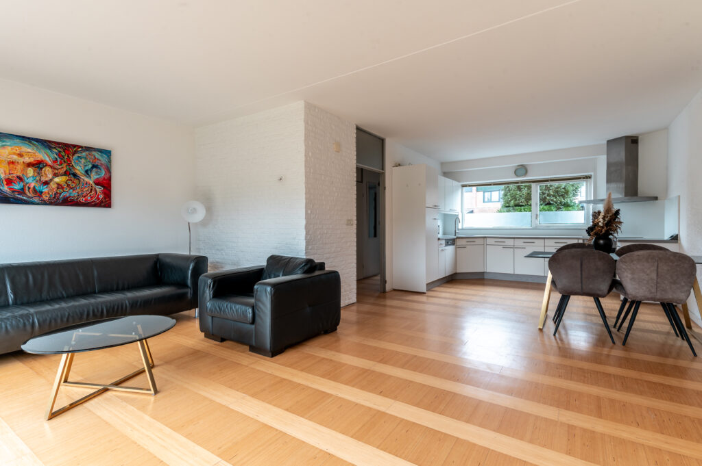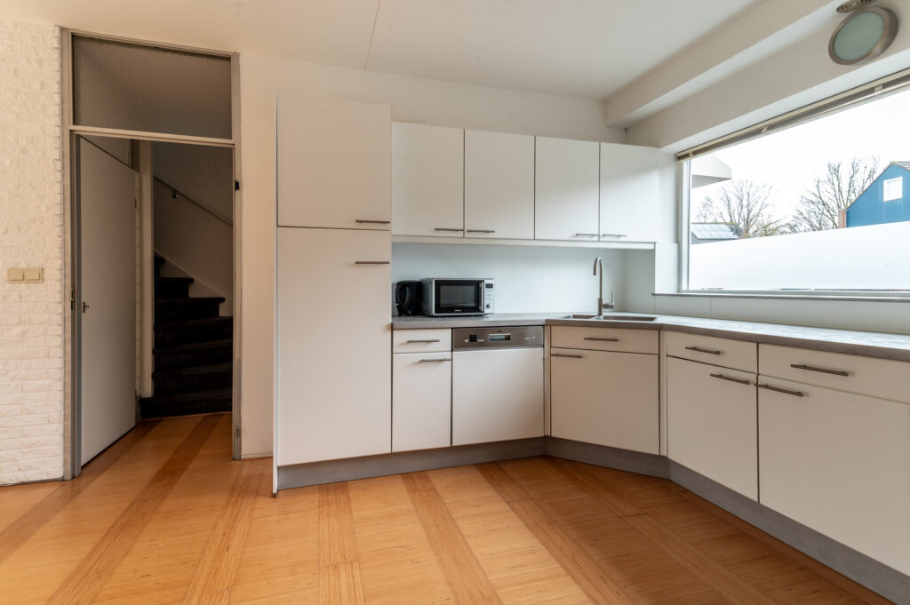 De woning beschikt over een fijne en lichte woonkamer waar grote raampartijen zorgen voor een prettige lichtinval. Dit is een heerlijke plek om samen te komen of juist tot rust te komen na een lange dag. De open keuken sluit hier mooi op aan en is voorzien van diverse inbouwapparatuur, waardoor koken hier zowel praktisch als plezierig is.