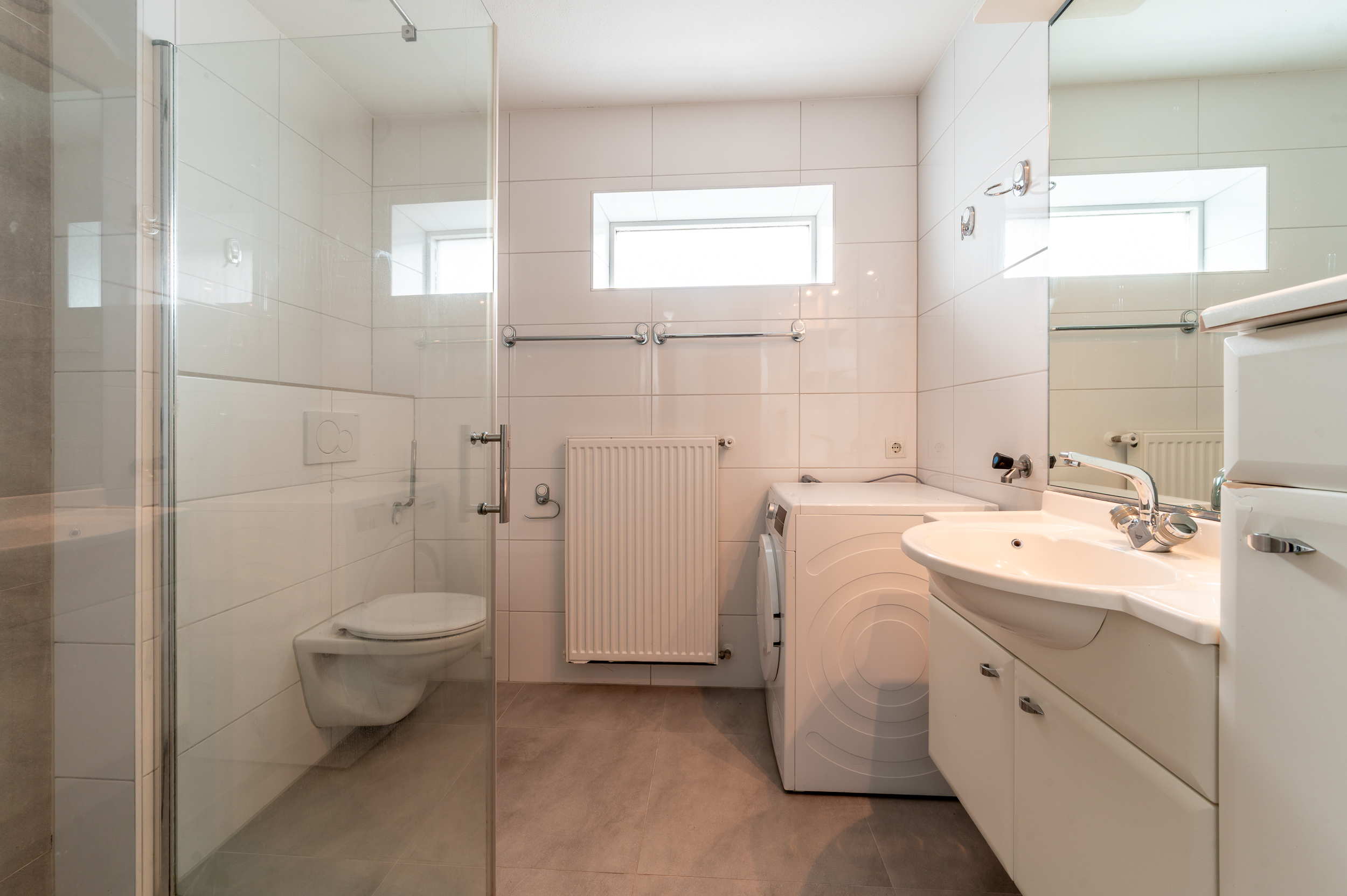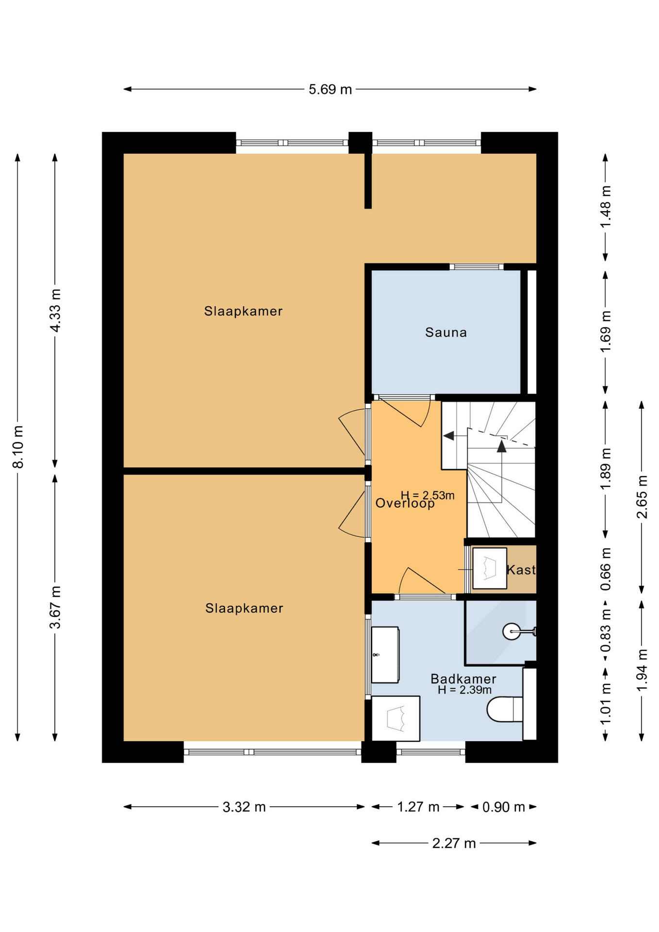 Op de eerste verdieping bevinden zich twee comfortabele slaapkamers. Eén van deze slaapkamers biedt toegang tot een sauna, wat zorgt voor een extra luxe element in huis. De badkamer is eveneens op deze verdieping gesitueerd en is compleet uitgevoerd met een wastafelmeubel, toilet, inloopdouche en de opstelling voor de wasmachine. De tweede verdieping biedt nog eens twee volwaardige slaapkamers, waardoor deze woning uitstekend geschikt is voor gezinnen, thuiswerken of het creëren van hobby- of logeerruimte.