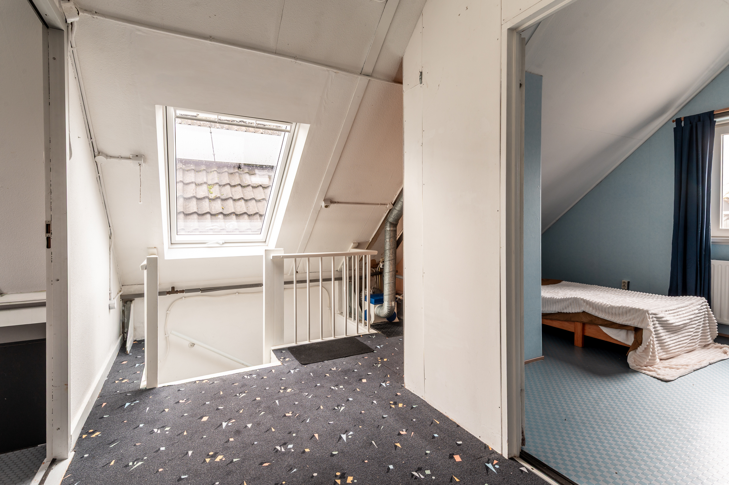Ruime overloop met dakraam en opstelling CV-ketel, slaapkamer 3 (ca. 18 m²), slaapkamer 4 (ca. 12 m²).