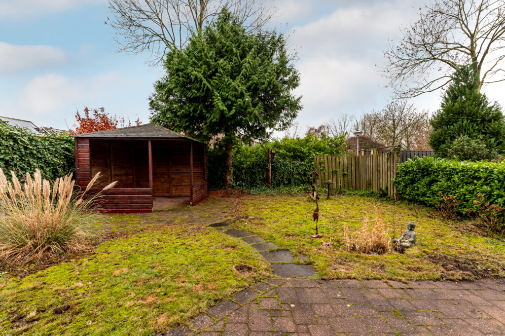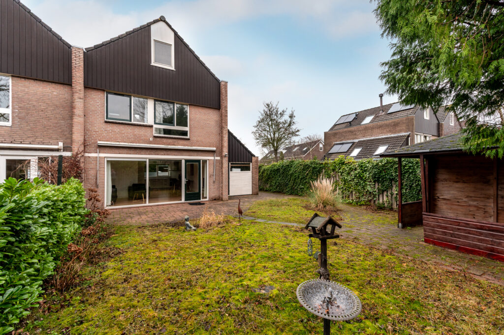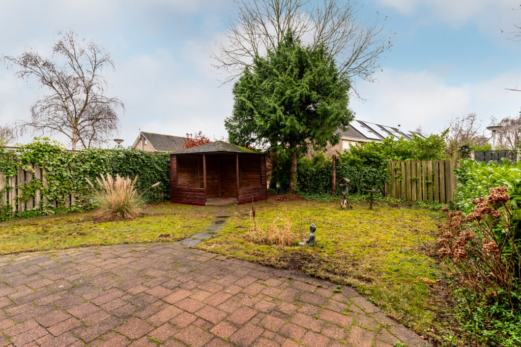 Buitenruimte is er in overvloed. De voortuin is gelegen op het noordwesten en biedt ruime parkeergelegenheid op eigen terrein, waardoor u eenvoudig meerdere auto’s kunt parkeren. Vanuit de voortuin heeft u direct toegang tot de aangebouwde garage. Via de zijtuin bereikt u de achtertuin, die met een afmeting van circa 12 bij 11 meter bijzonder royaal is. Deze tuin is gelegen op het zuidoosten, waardoor u hier optimaal kunt genieten van de zon. Doordat er geen directe achterburen zijn, ervaart u hier een fijne mate van privacy en rust.