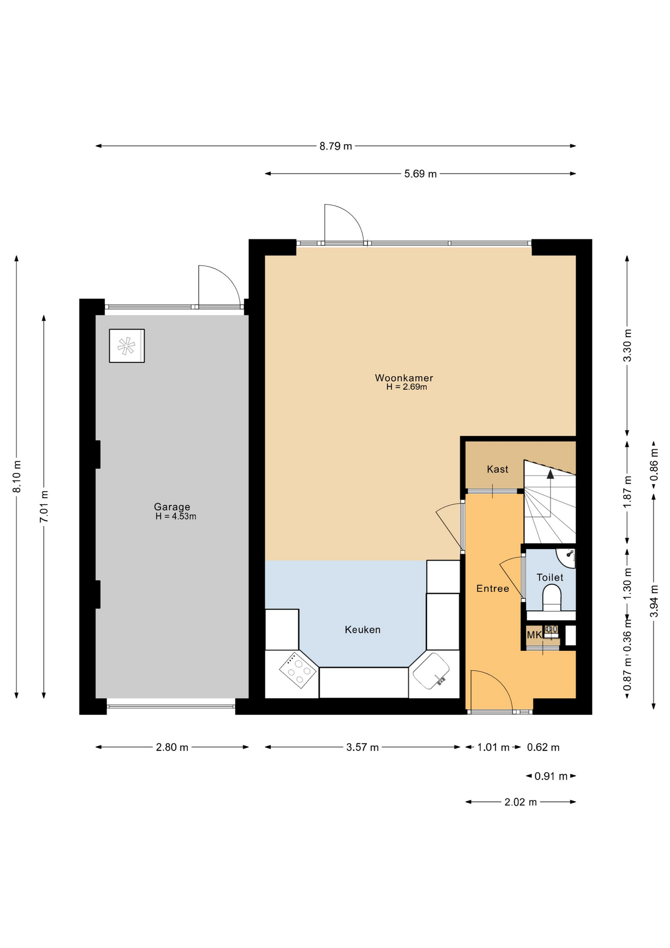 Entree, hal, toilet met fonteintje, trapkast, ruime en lichte woonkamer (ca. 20 m²) met deur naar de achtertuin, open keuken voorzien van inbouwapparatuur.