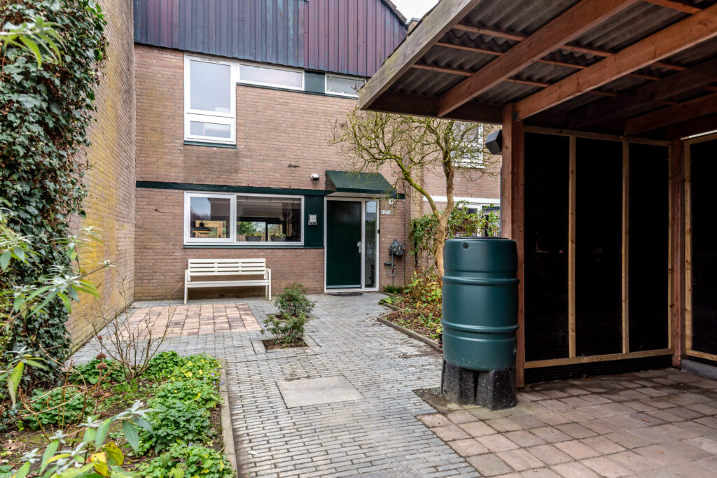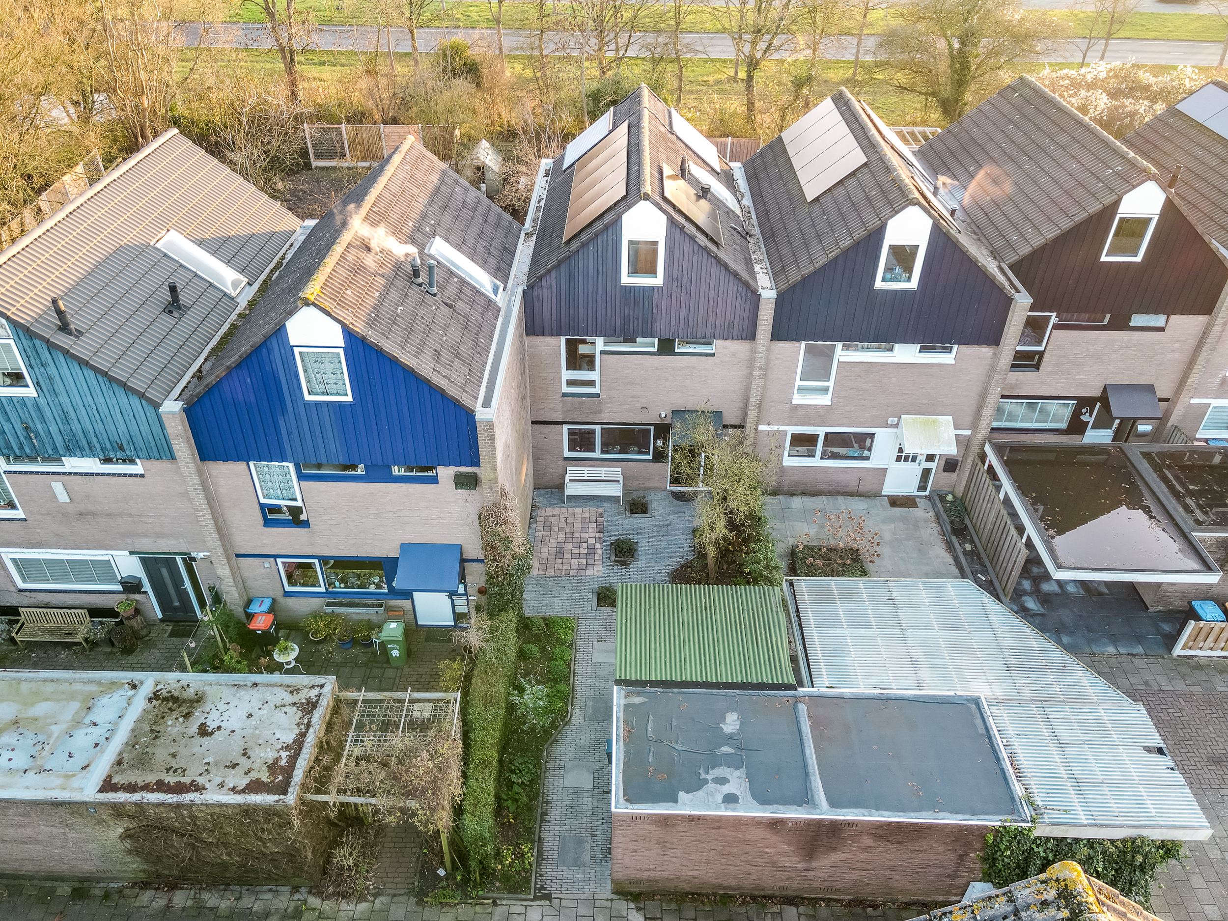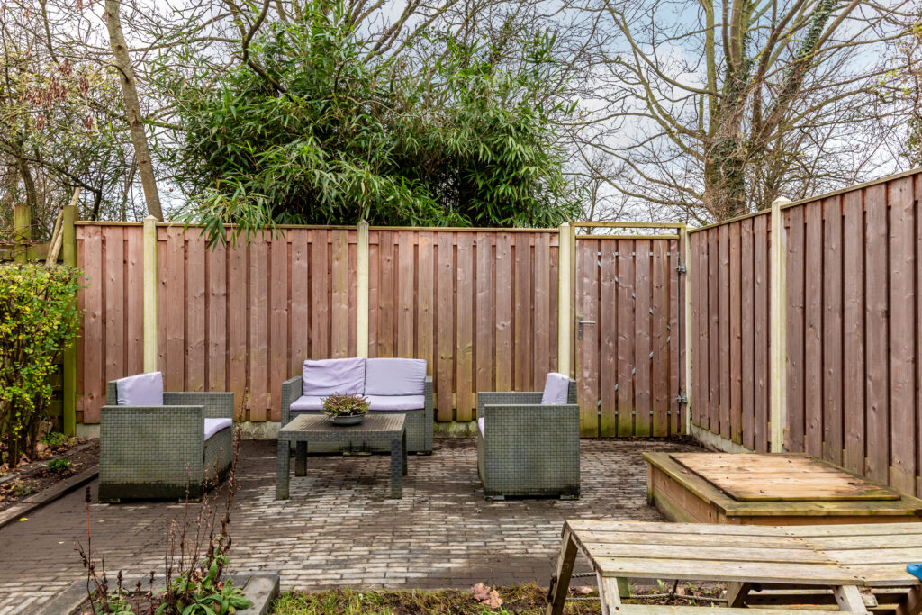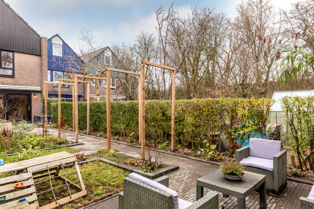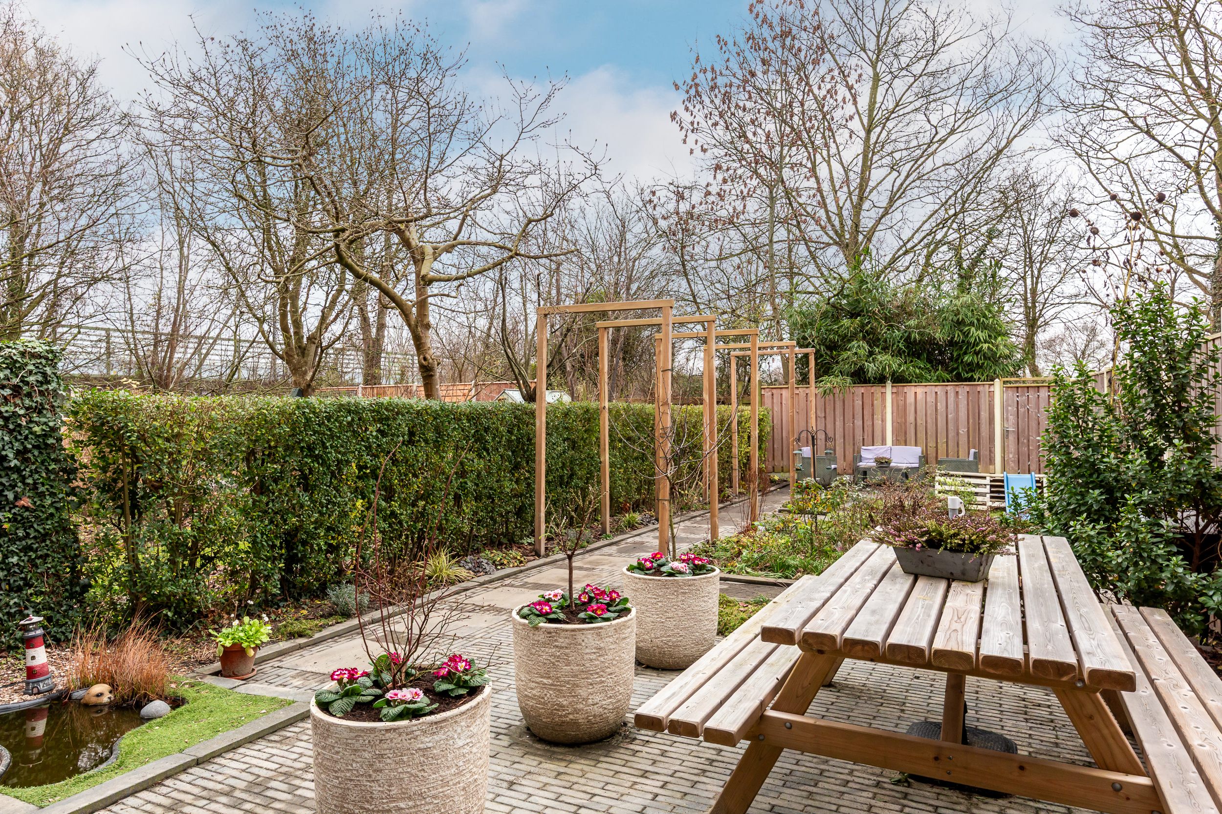 De voortuin ligt op het noorden en beschikt over een overkapping voor fietsen en een vrijstaande stenen berging. De zeer diepe achtertuin is gelegen op het zonnige zuiden en biedt veel privacy, volop zon en een praktische achterom.