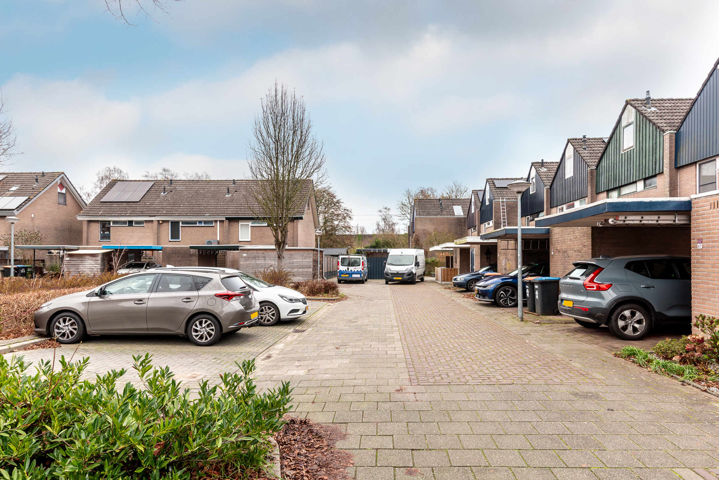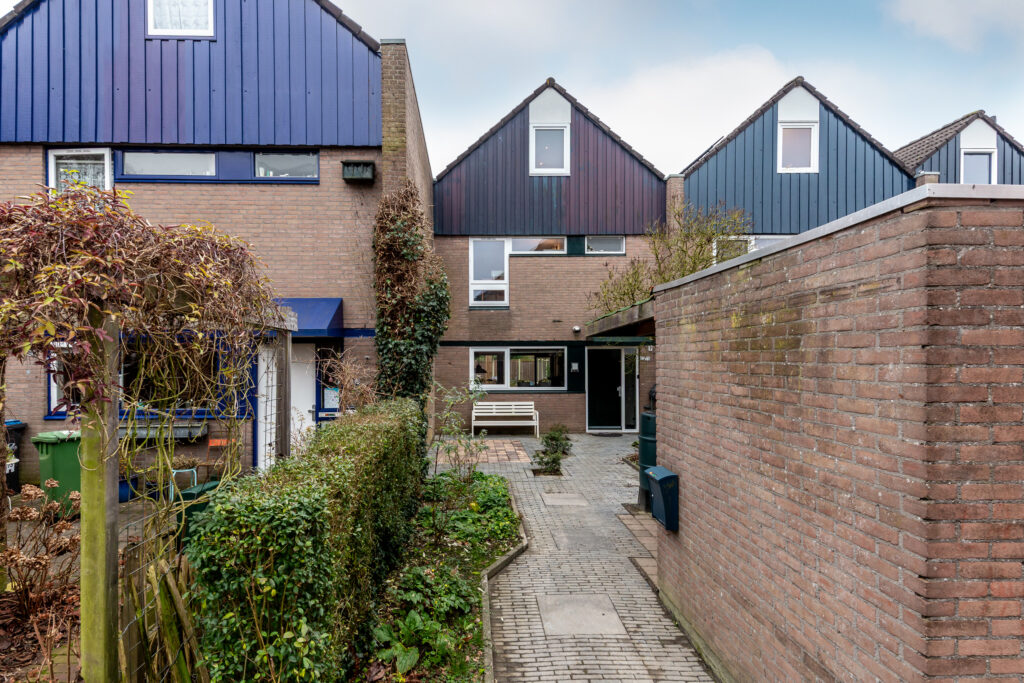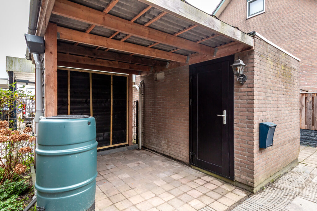 De voortuin (11x6 meter) is gelegen op het noorden en is grotendeels betegeld. U treft hier ook nog aan de overkapping voor de fietsen en de vrijstaande stenen berging (ca. 8 m²).