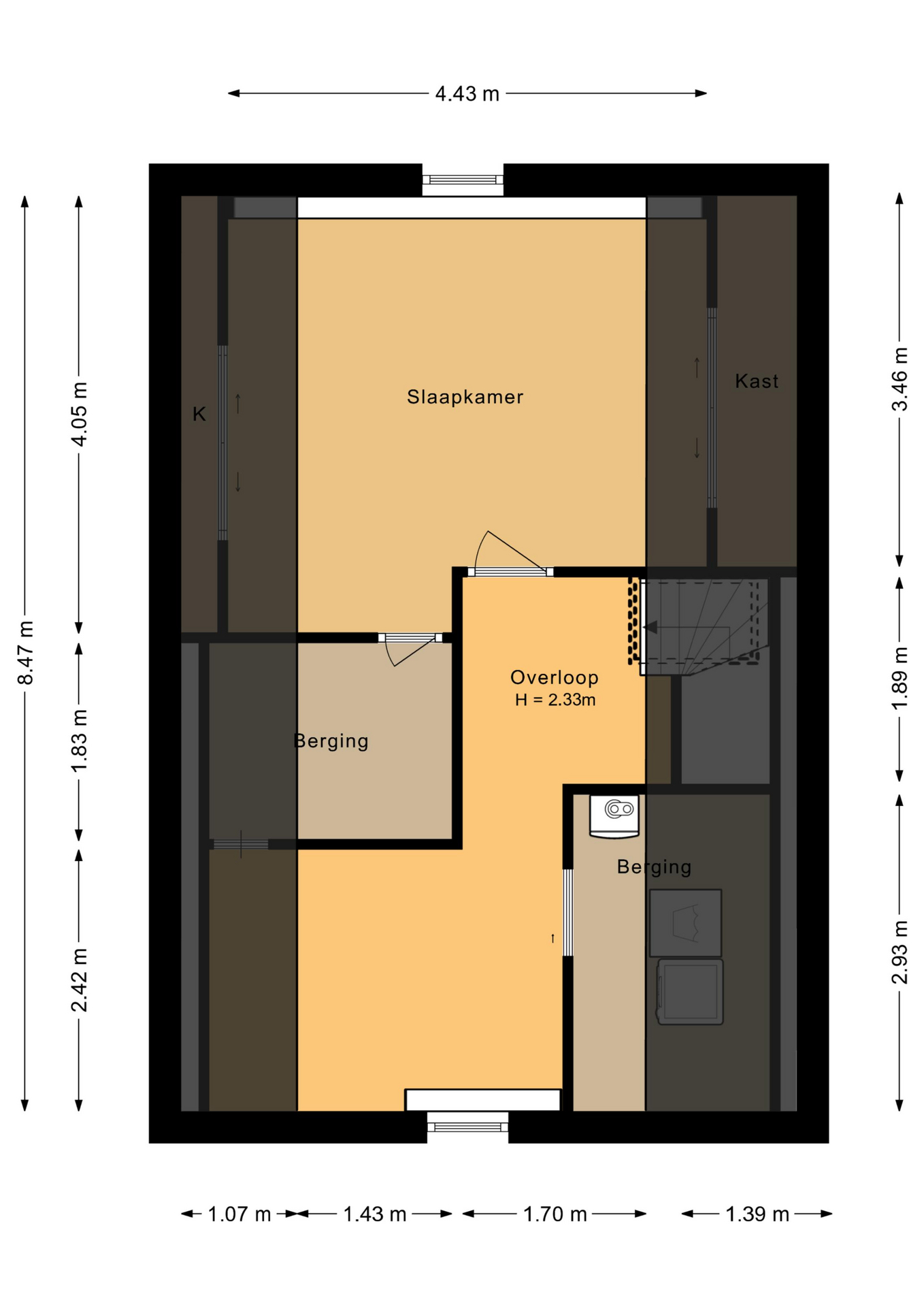 Ruime overloop, (slaap)kamer 4 (ca. 10 m²), aparte ruimte met opstelling CV-ketel en opstelling wassen-/drogen, slaapkamer 5 (ca. 15 m²) met aan beide zijde opbergruimte achter de knieschotten, aparte bergruimte (ca. 4 m²).