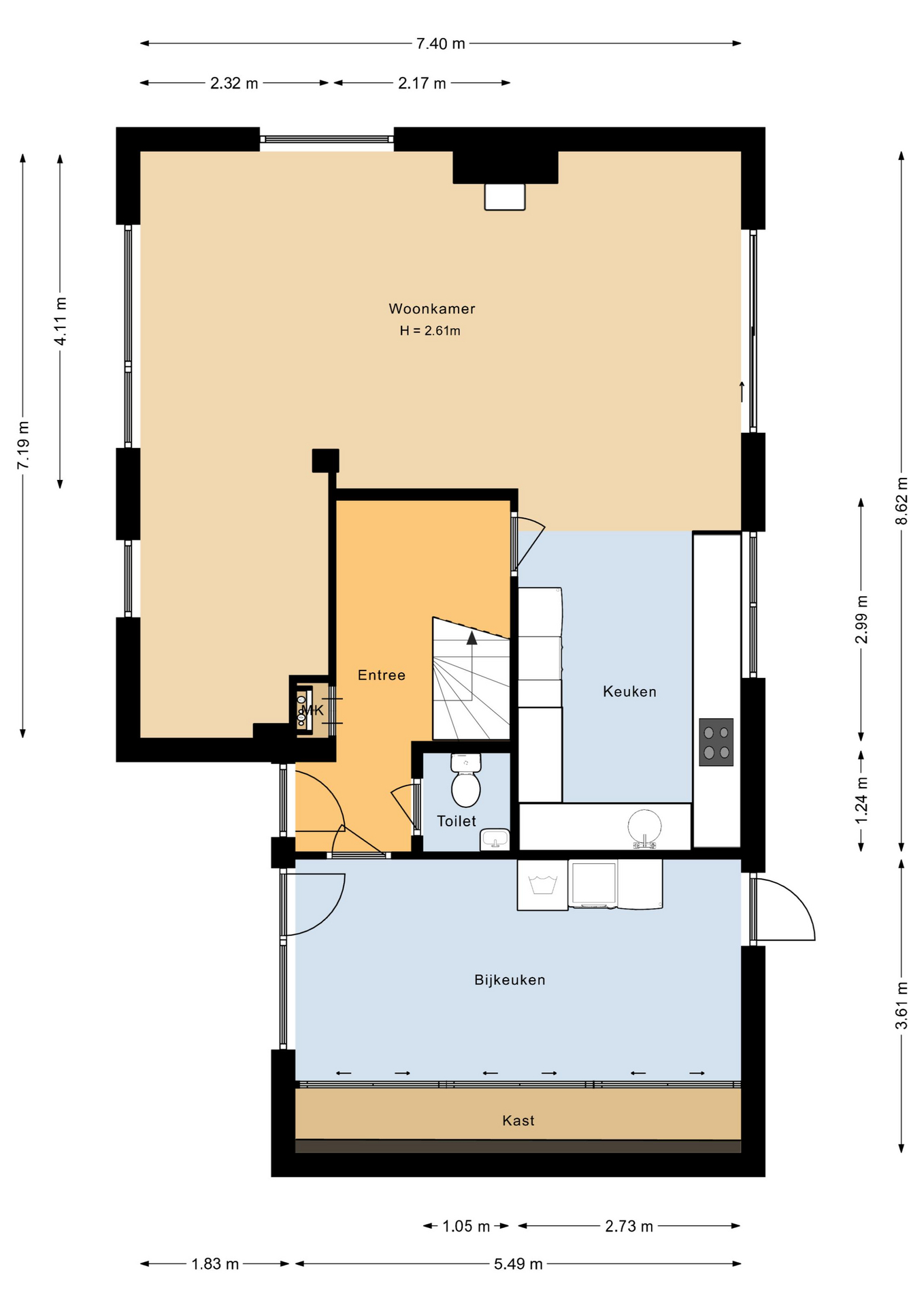 Entree/hal met de toiletruimte, garderobe, meterkast, trapopgang naar de verdieping en toegang tot de voormalige garage en de woonkamer. Een heerlijke en knusse woonkamer met grote raampartijen, een sfeervolle houtkachel (Jottul) en een praktische werkplek/studieruimte aan de voorzijde van de woning. Aan de achterzijde bevindt zich de keurige inbouwkeuken in U-opstelling, welke voorzien is van de volgende apparatuur; koelkast, vriezer, oven, 4-pits kookplaat en een afzuigkap. Ruime opstelmogelijkheden voor een grote eettafel waar u heerlijk met uw familie kunt dineren. De begane grond is voorzien van een lichte tegelvloer en middels de schuifpui heeft u toegang tot de tuin met ligging op het zuiden! De voormalige garage is omgebouwd tot woonruimte en momenteel in gebruik als bijkeuken met de opstelplaats van de wasmachine en droger en veel praktische bergruimte. Optioneel kan deze ook worden omgebouwd tot slaapkamer/badkamer maar ook een praktijk aan huis zou tot de mogelijkheden behoren.