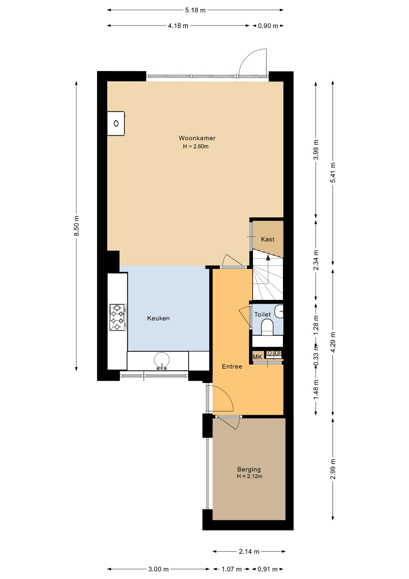 Entree, hal, toilet met fonteintje, toegang tot de aangebouwde berging (ca. 6 m²), ruime en lichte woonkamer (ca. 28 m²) met sfeervolle houtkachel, trapkast, deur naar de tuin, ruime L-vormige open keuken voorzien van diverse inbouwapparatuur.