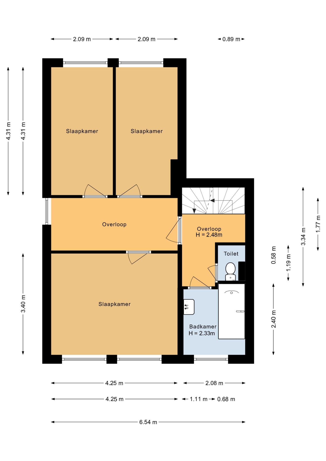 Eerste verdieping: Riante overloop met de toiletruimte, toegang tot 3 ruime slaapkamers (ca. 14 / 9 / 9 m2) en de badkamer. De badkamer is voorzien van een ligbad, wastafel, verwarming en een raam voor de natuurlijke ventilatie. De overloop is ruim genoeg voor een grote kastenwand of kan eventueel dienen als handige thuiswerkplek!