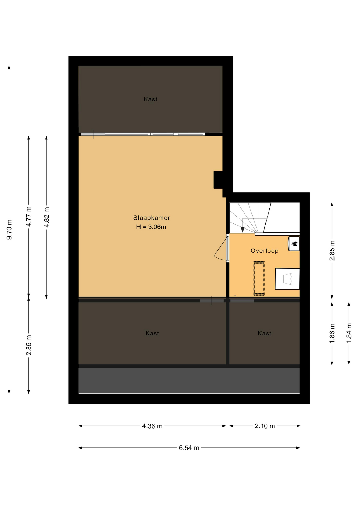 Tweede verdieping: Overloop met de opstelling van de cv-ketel (2019, eigendom), wasmachineaansluiting en veel praktische bergruimte. Toegang tot de ruime 4e slaapkamer (maar liefst 21 m2 groot!) met wederom veel bergruimte achter de knieschotten.