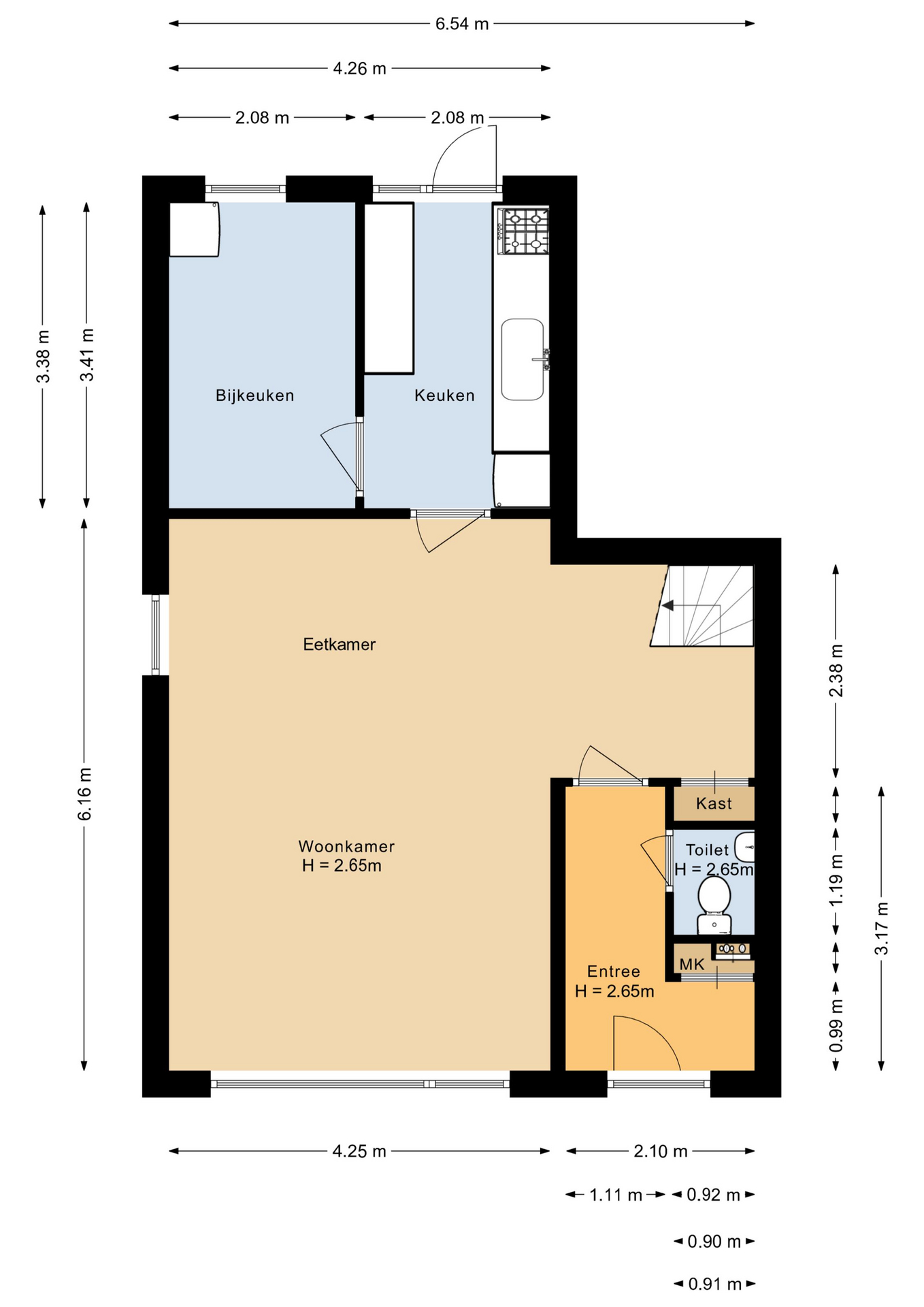 Begane grond: Entree/hal, meterkast, toiletruimte en toegang tot de woonkamer. Ruime straatgerichte woonkamer met grote raampartijen (veel lichtinval!), een praktische bergkast en spiltrap naar de eerste verdieping. Aan de achterzijde bevindt zich de nette keuken voorzien van diverse apparatuur met toegang tot de bijkeuken. Indien de voorkeur uitgaat naar een meer open indeling, bestaat de mogelijkheid om de keuken en bijkeuken bij de woonkamer te betrekken en zo een open keuken te creëren. Via zowel de bijkeuken als de keuken is de achtertuin via een loopdeur te bereiken.