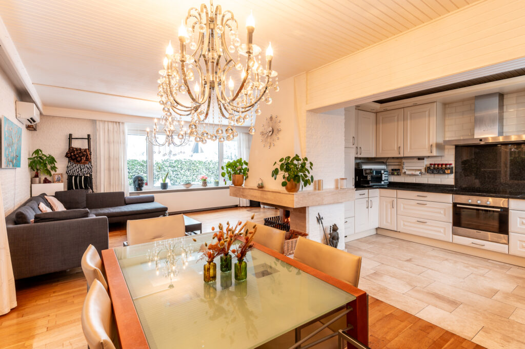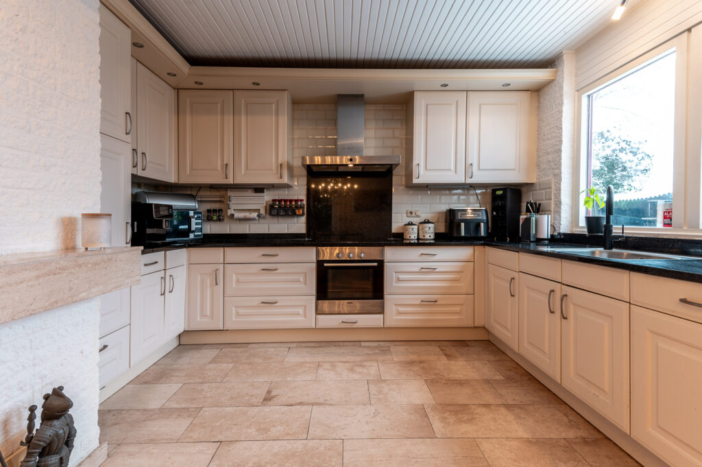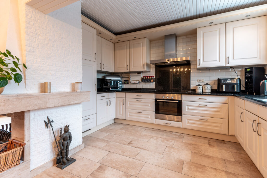 De ruime keuken in U-opstelling is voorzien van een granieten werkblad en diverse inbouwapparatuur, waaronder een oven, inductiekookplaat, afzuigkap, vaatwasser en een Quooker-kraan (2024). Aangrenzend bevindt zich de ruime eetkamer met plaats voor een grote eettafel en openslaande deuren naar de achtertuin. De woonkamer wordt verwarmd middels elektrische verwarming en airconditioning.
