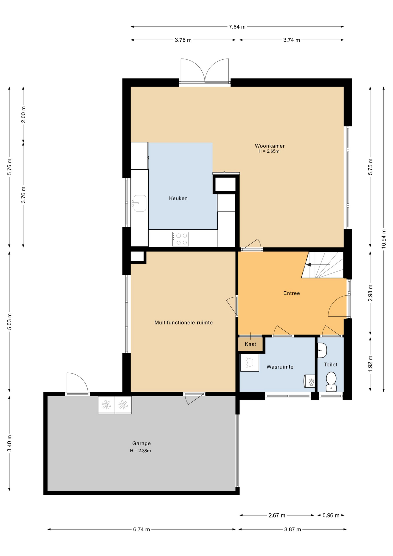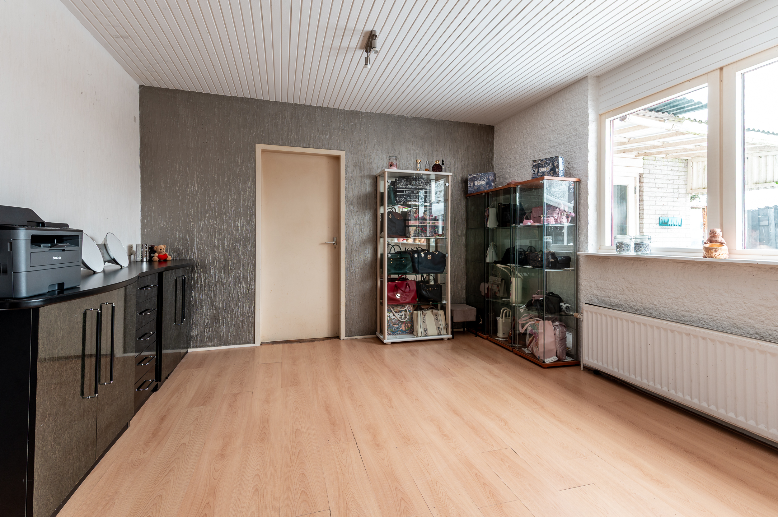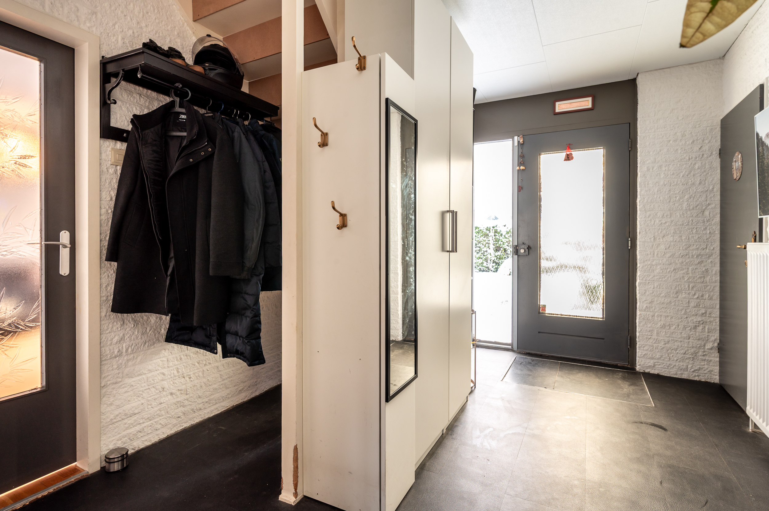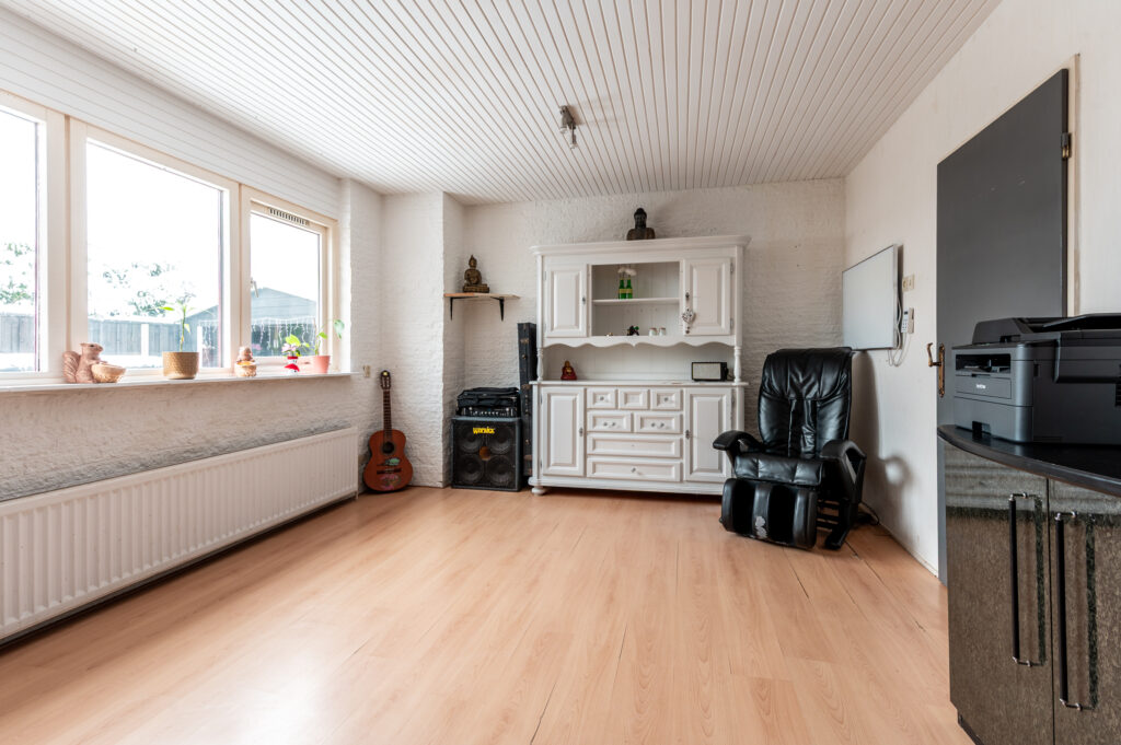 Ruime entree/hal met meterkast, garderobe, trapopgang, toiletruimte met fonteintje en een praktische ruimte met opstelling voor wasmachine/droger en de elektrische boiler (2020). Vanuit de hal heeft u toegang tot de woonkamer en de multifunctionele kamer, ideaal als slaap- of werkkamer, met directe doorgang naar de royale garage (3,40 x 6,74 meter).